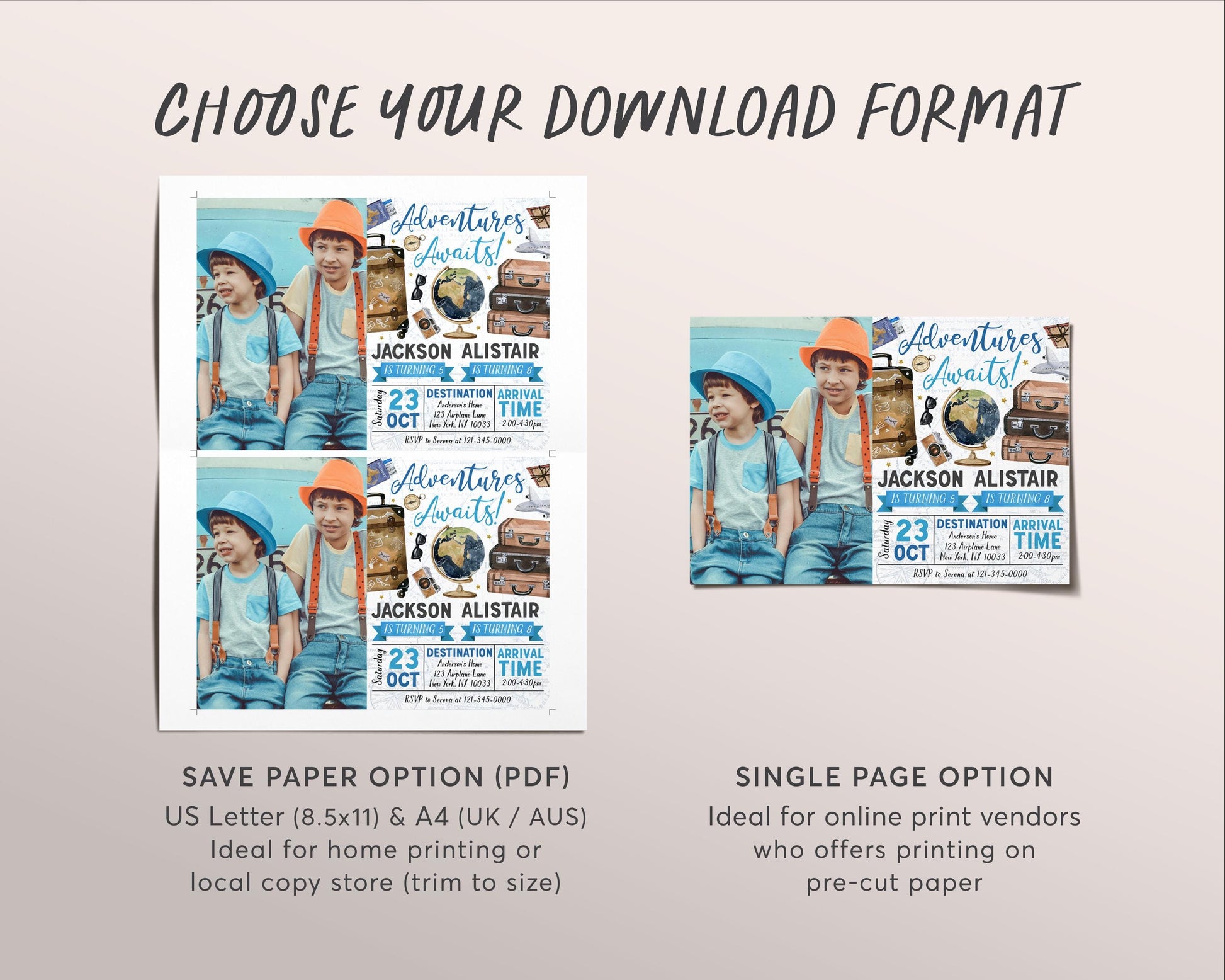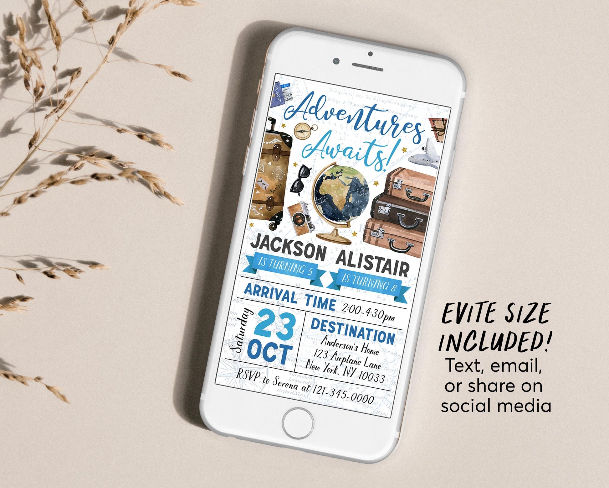 Adventure Awaits Travel Joint Siblings Birthday Invitation With Photo Editable Template, Twin Boys Around the World Party Invite Map Evite