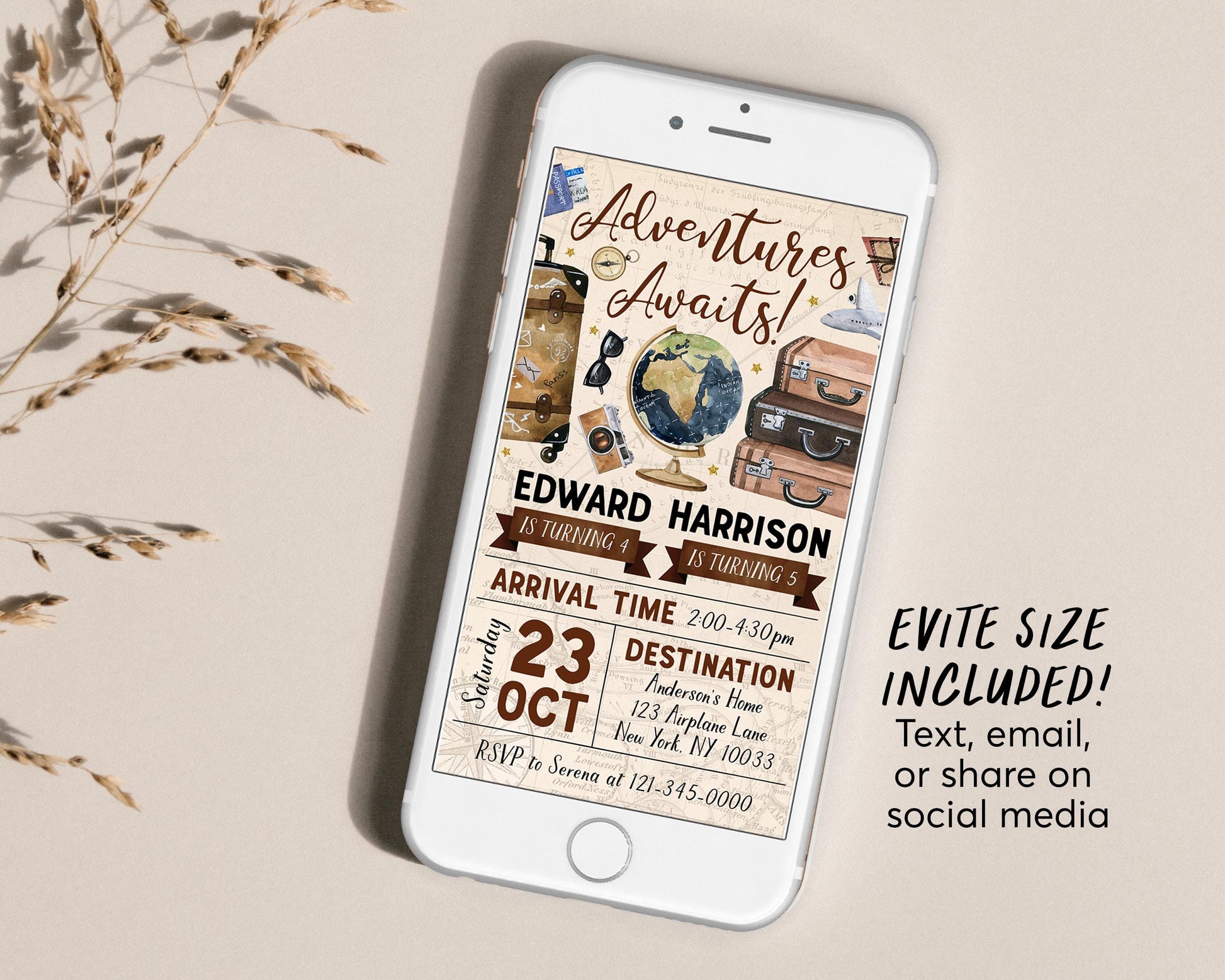 Adventure Awaits Travel Joint Siblings Birthday Invitation With Photo Editable Template, Twins Around the World Party Invite, Plane Evite