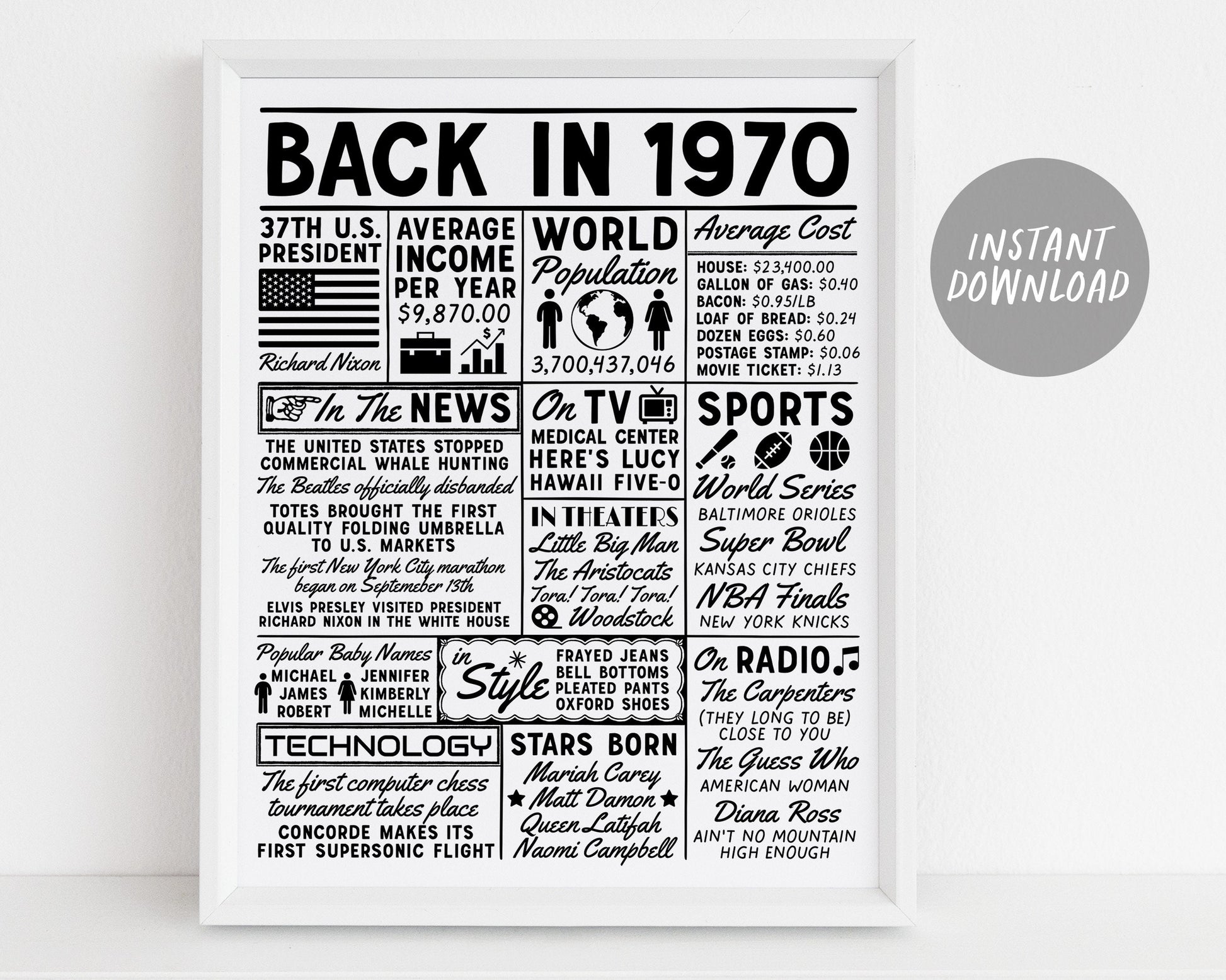 Back in 1970 DIGITAL Sign Printable, 70s Time Capsule, Born in 1970, Vintage Chalkboard Newspaper Fun Facts Poster For Birthday Anniversary