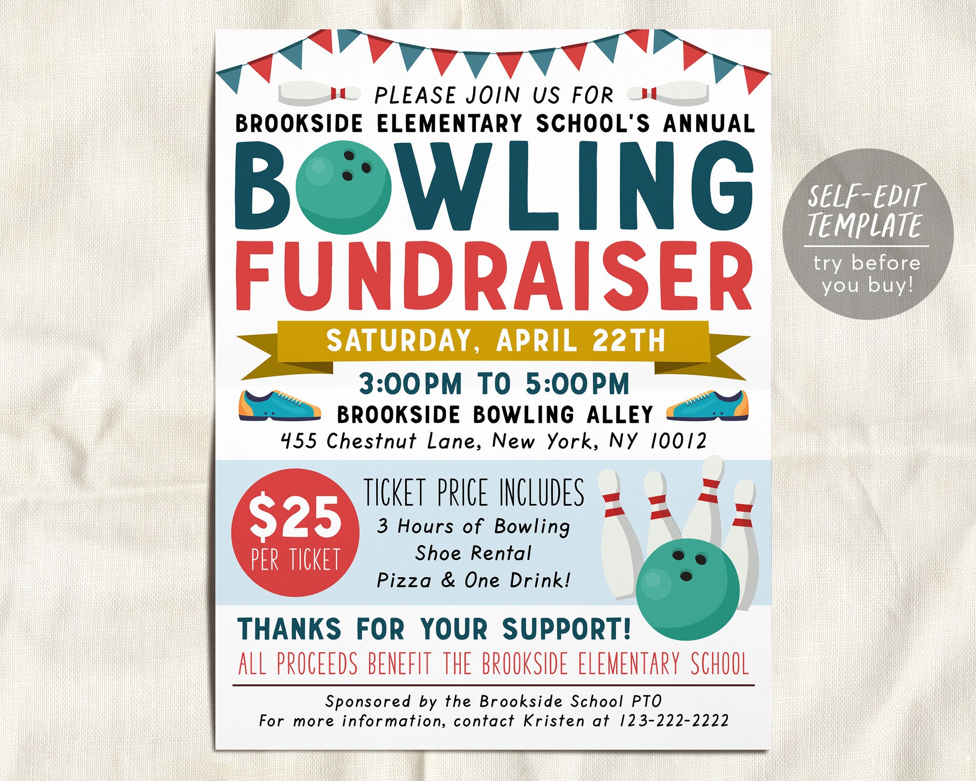 Bowling Fundraiser Flyer Editable Template, Family Bowling Night School PTA PTO Invite, Church Nonprofit Business Charity Benefit Event