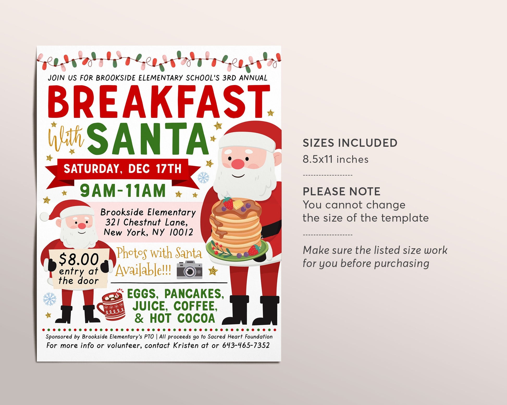 Breakfast with Santa Flyer Editable Template, Pancakes with Santa Invitation, Kids Christmas Party Holiday Invite, Church School PTO PTA