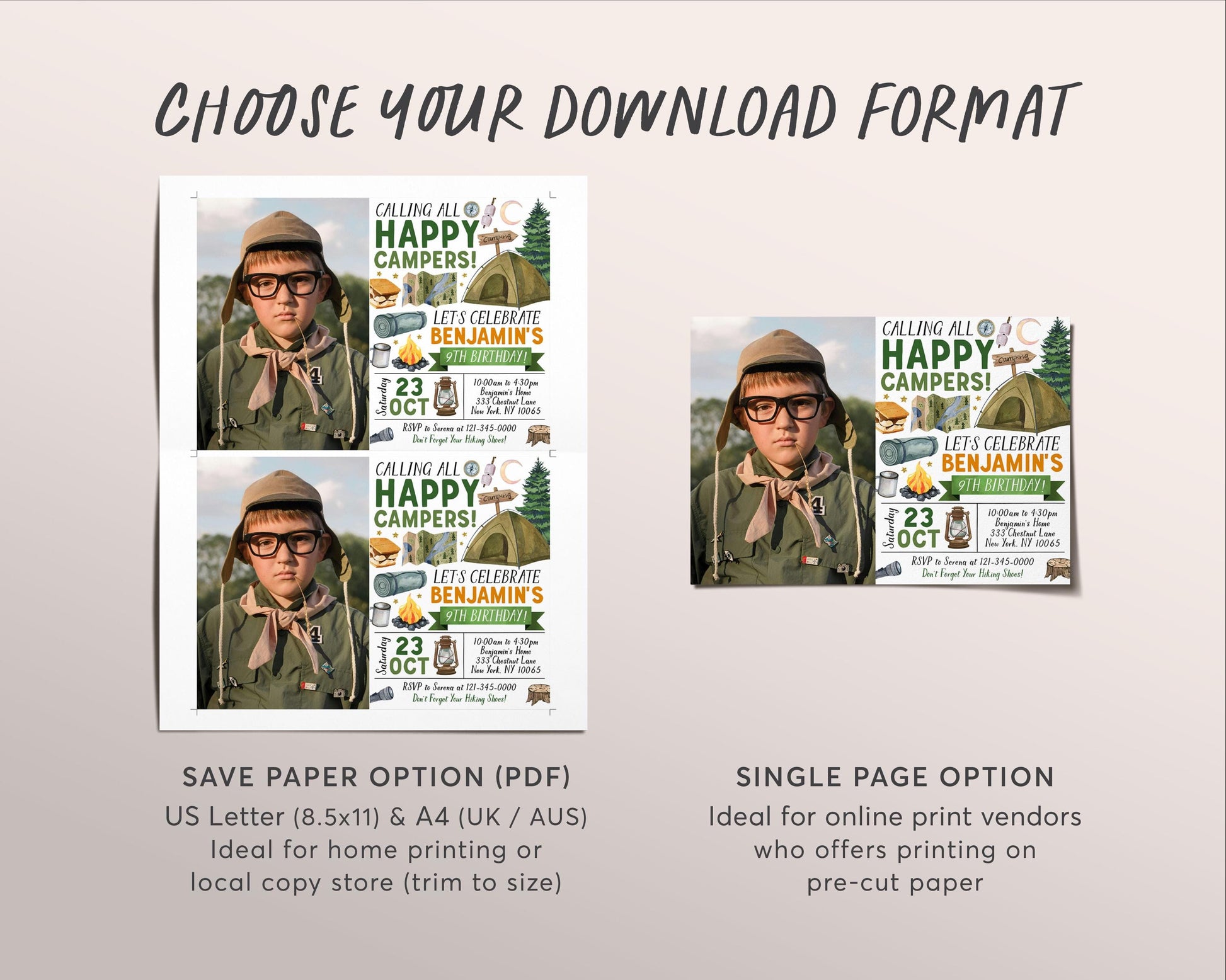 Camping Birthday Invitation With Photo Editable Template, Outdoor Camp Out Party Invite, Camp Checklist, Rustic Tent Sleepover Hiking Evite