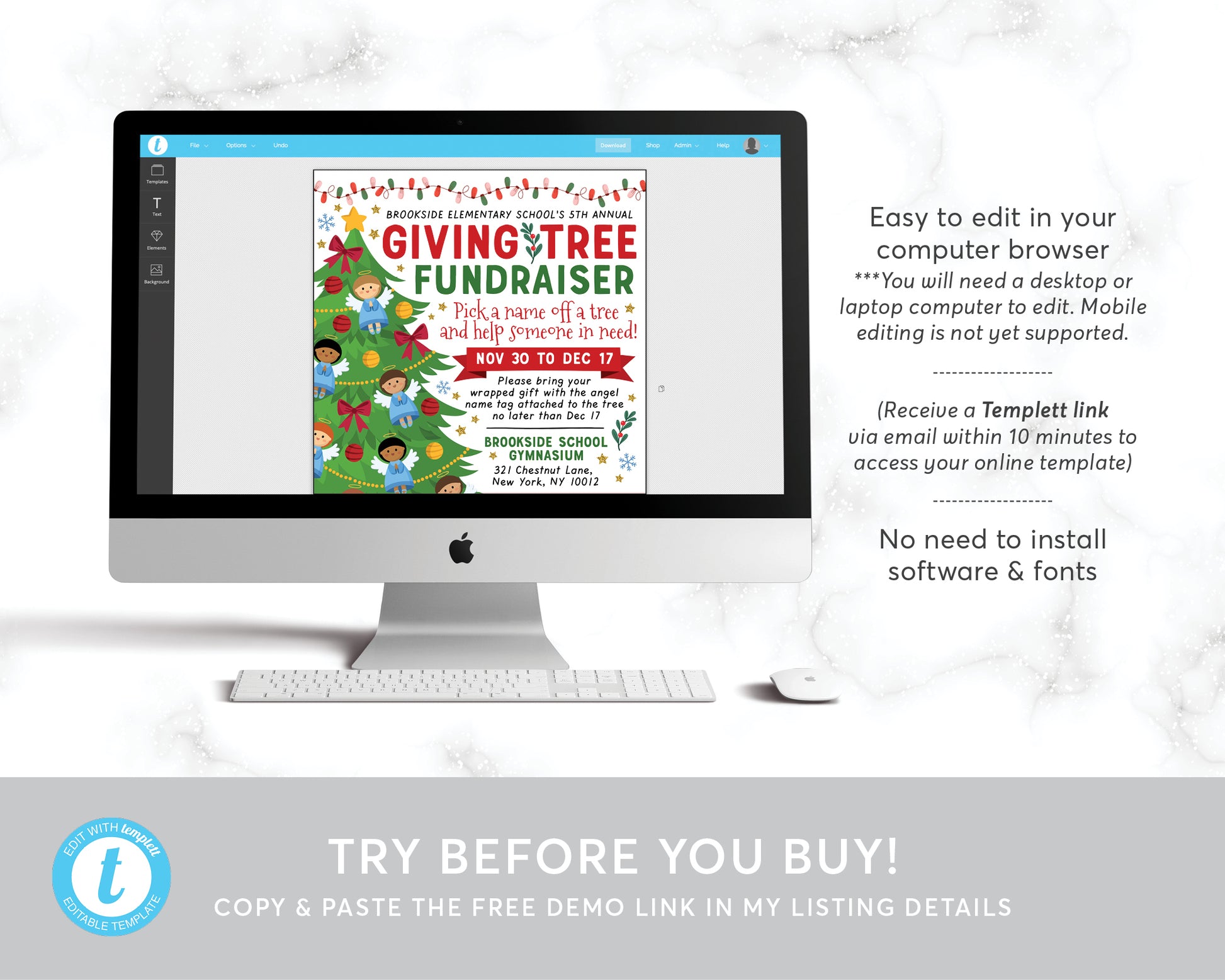 Christmas Giving Tree With Angels Fundraiser Flyer Editable Template, Charity Nonprofit Toy Drive Community Xmas Event Church School PTO PTA