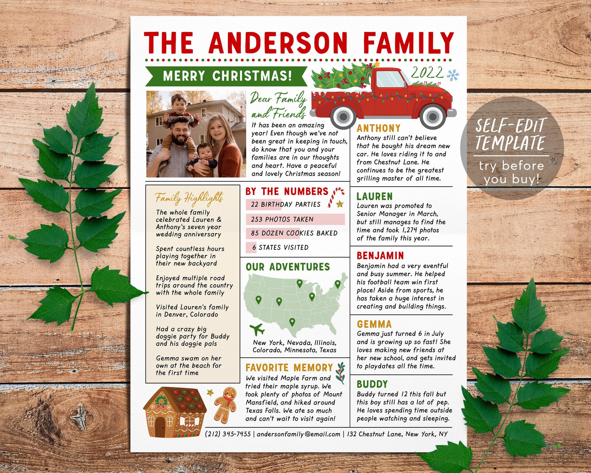 Christmas Newsletter Editable Template, Year In Review Family Update, Year at a Glance, Xmas Post With Photo, Holiday Letter Infographic