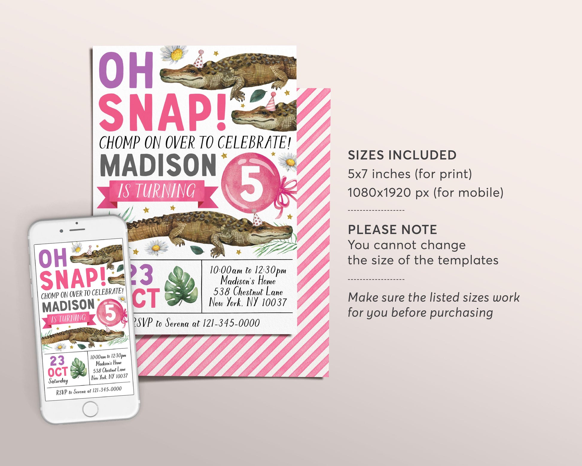 Crocodile Birthday Invitation Editable Template, Girl Oh Snap Crocodile Theme Party Invite, Floral Daisy Alligator Nature Chomp Chomp Evite
