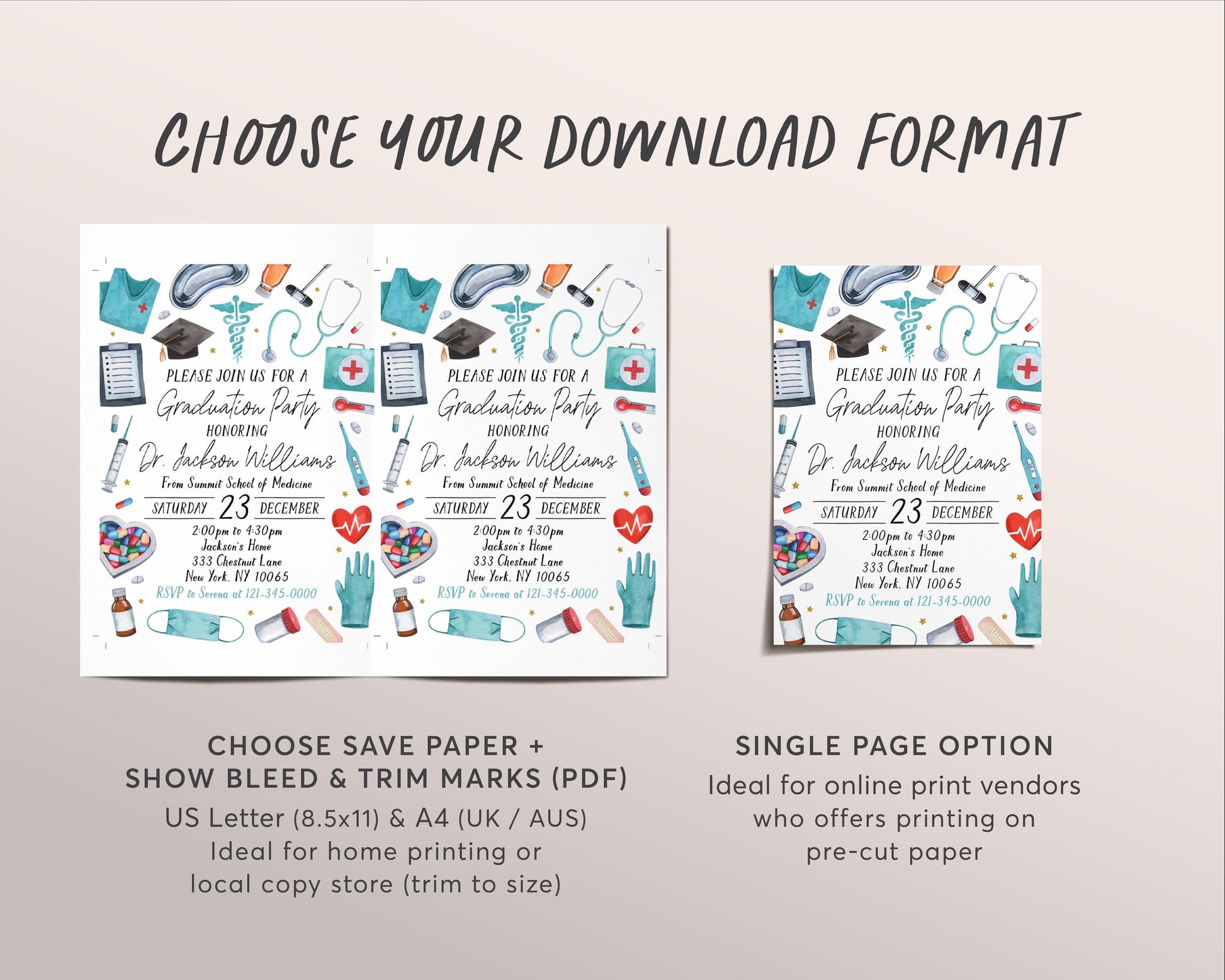Doctor Graduation Invitation Editable Template, Medical School Grad Announcement Party Invite Men or Women, Physician MD DR Pharmacist Evite