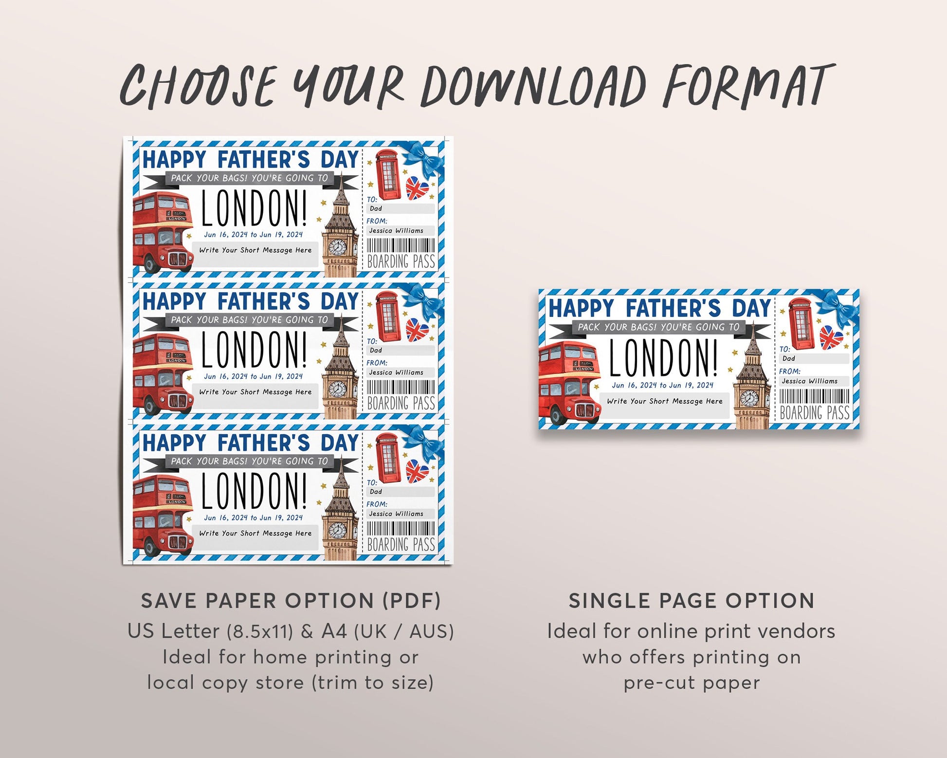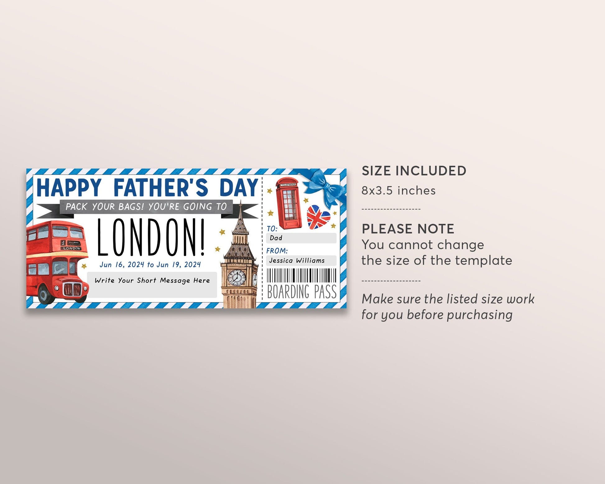 Fathers Day London Gift Ticket Boarding Pass Editable Template, Surprise Travel Vacation Plane Ticket Certificate For Dad England Trip