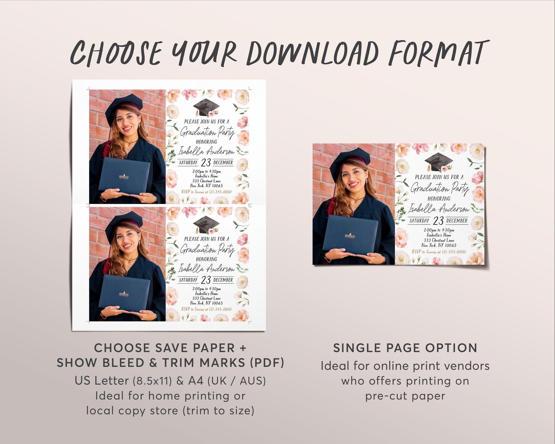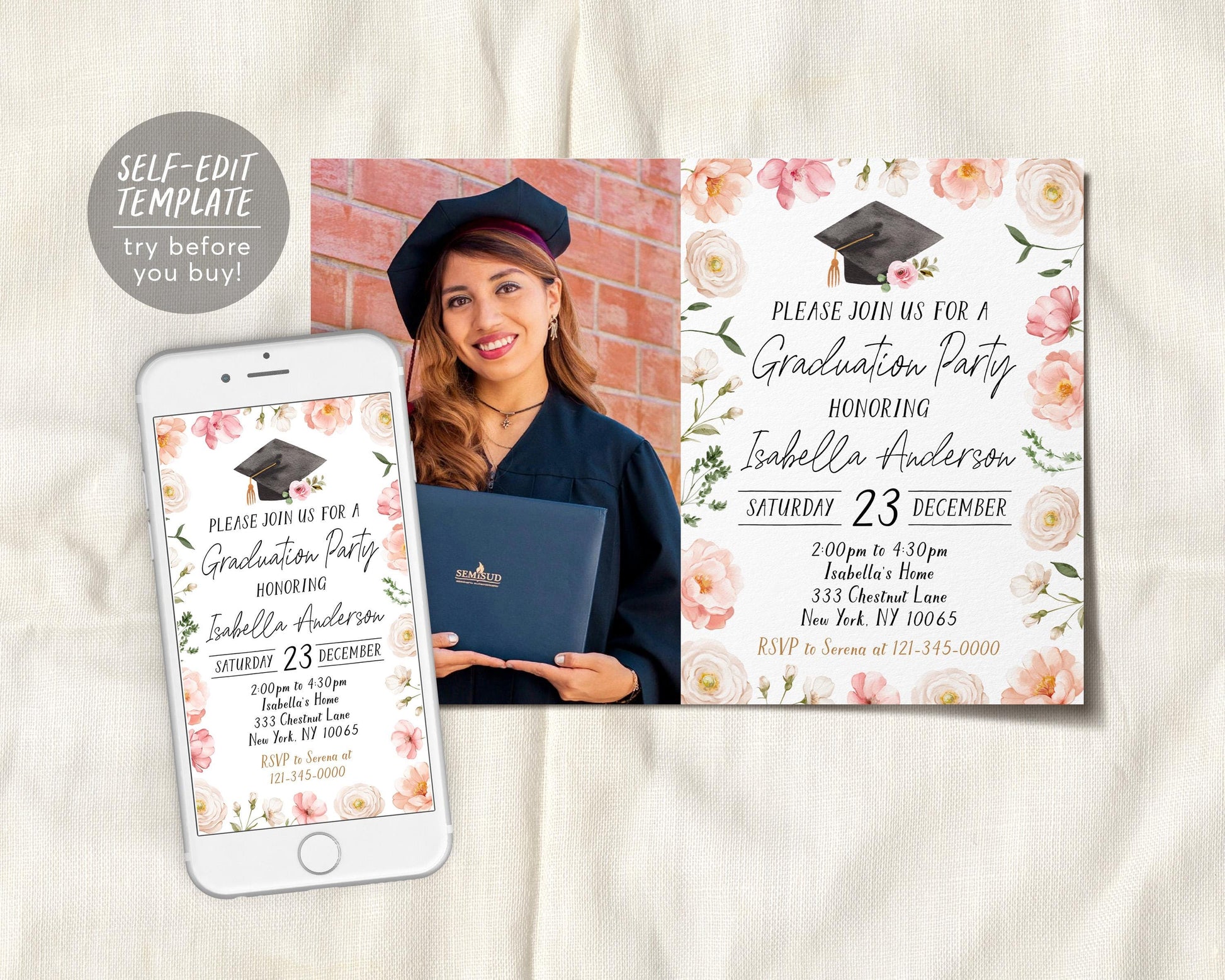 Graduation Floral Invitation With Photo Editable Template, Blush Floral Grad Announcement Party Invite for Her, College High School Evite