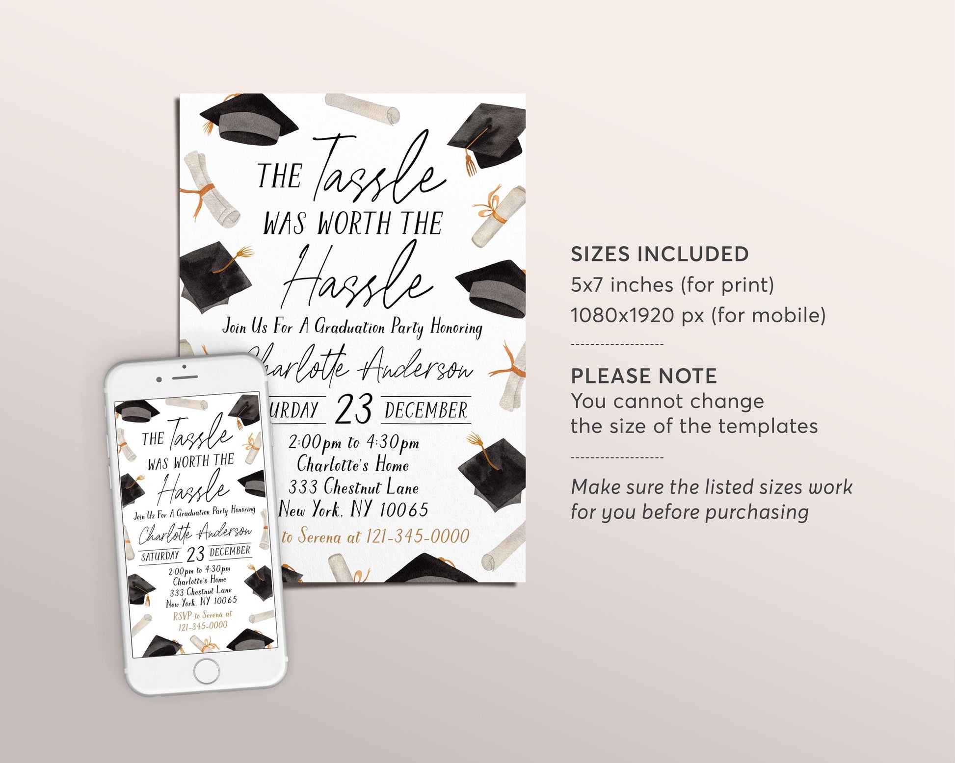 Graduation Invitation Editable Template, Tassel Was Worth The Hassle Grad Announcement Party Invite for Him Her Unisex, College High School