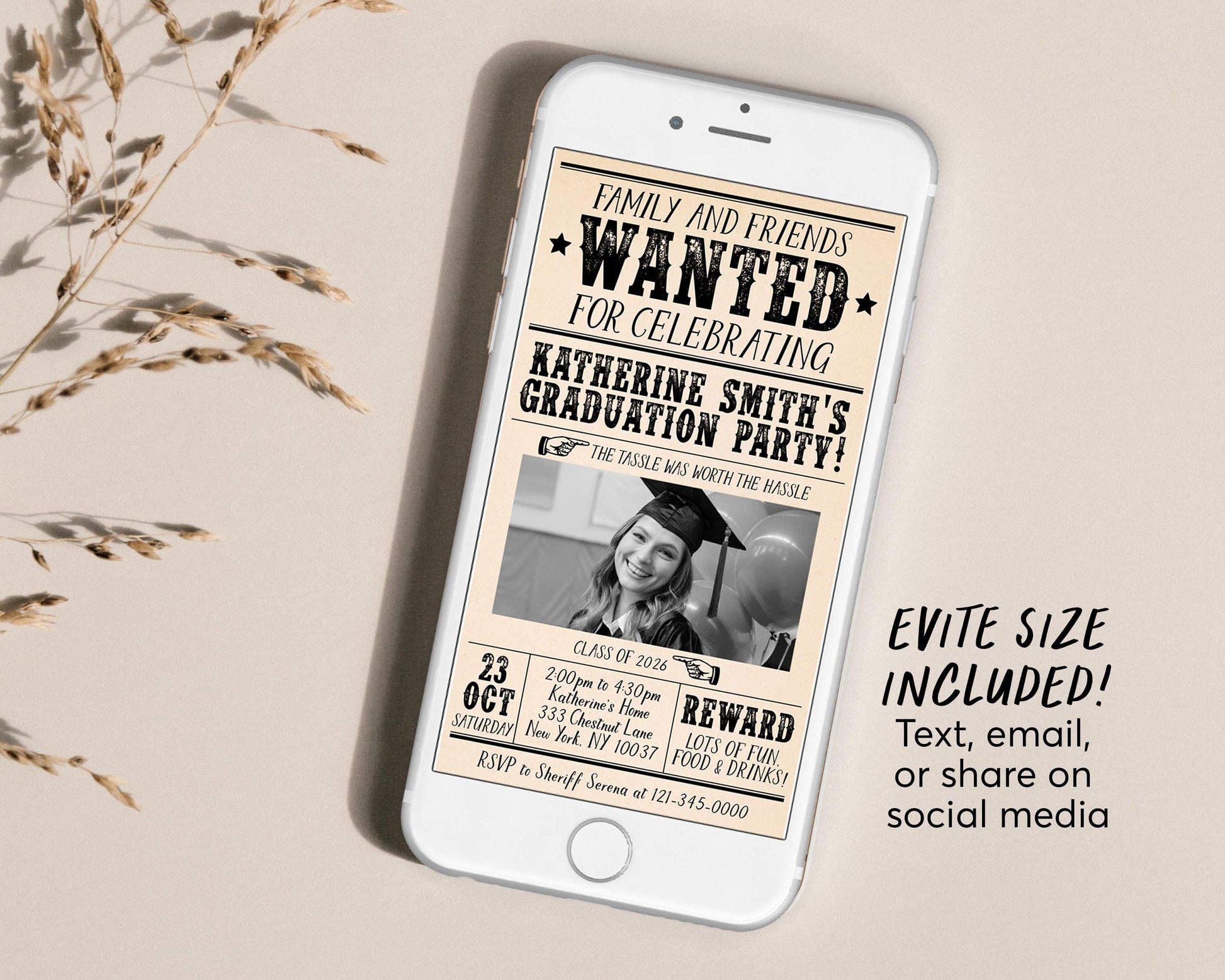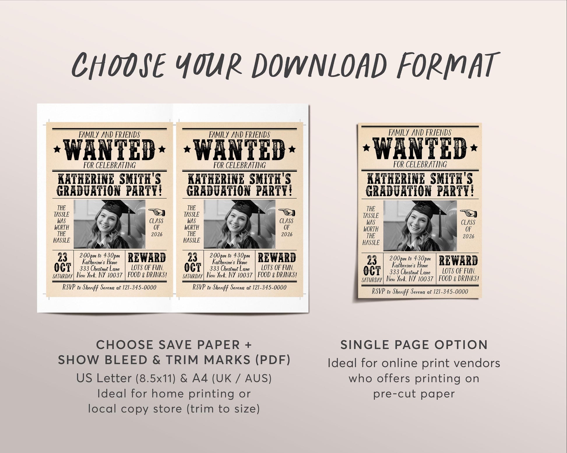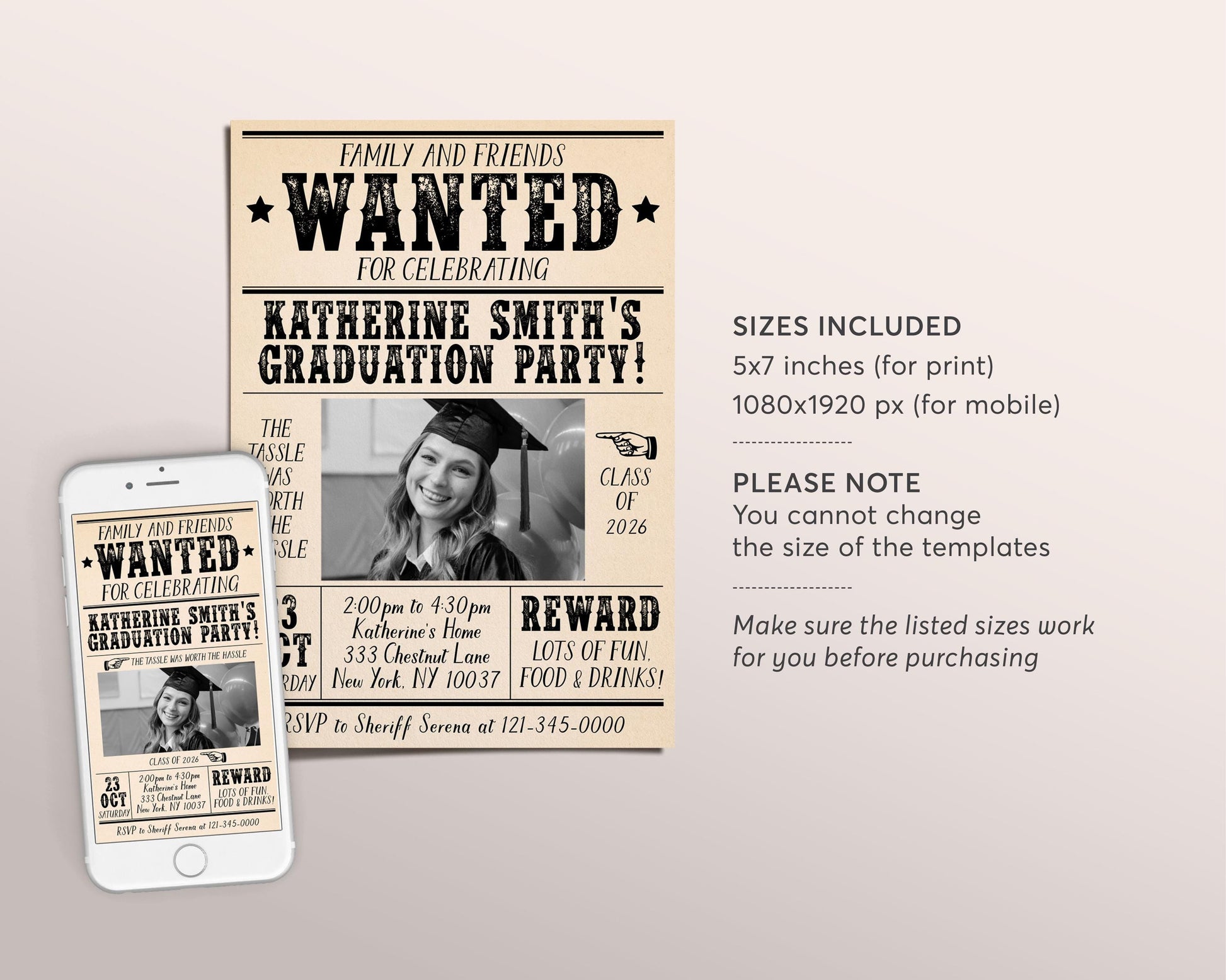 Graduation Wanted Poster Invitation Editable Template, Senior Graduation Announcement Party Newspaper Invite, Grad College High School Evite