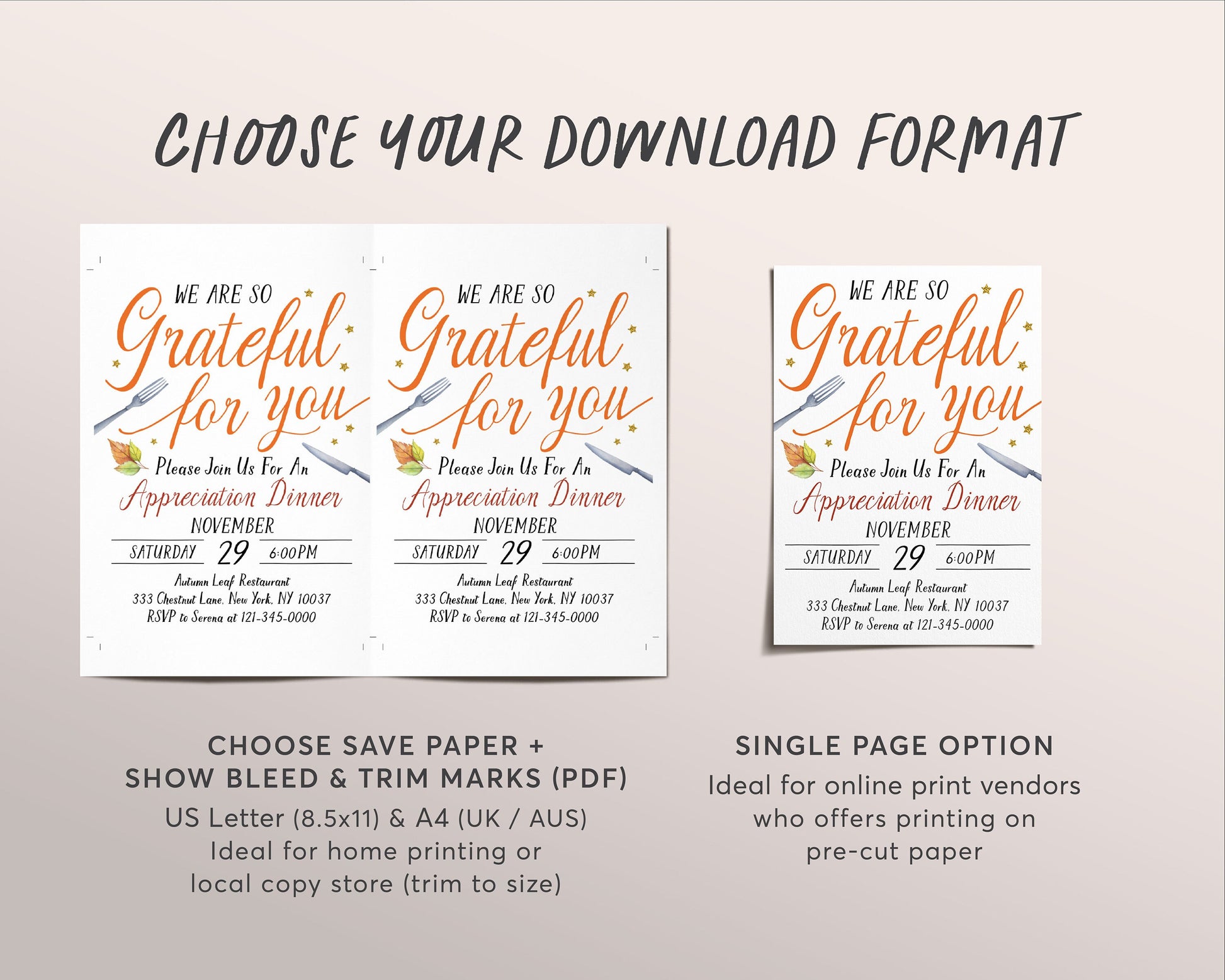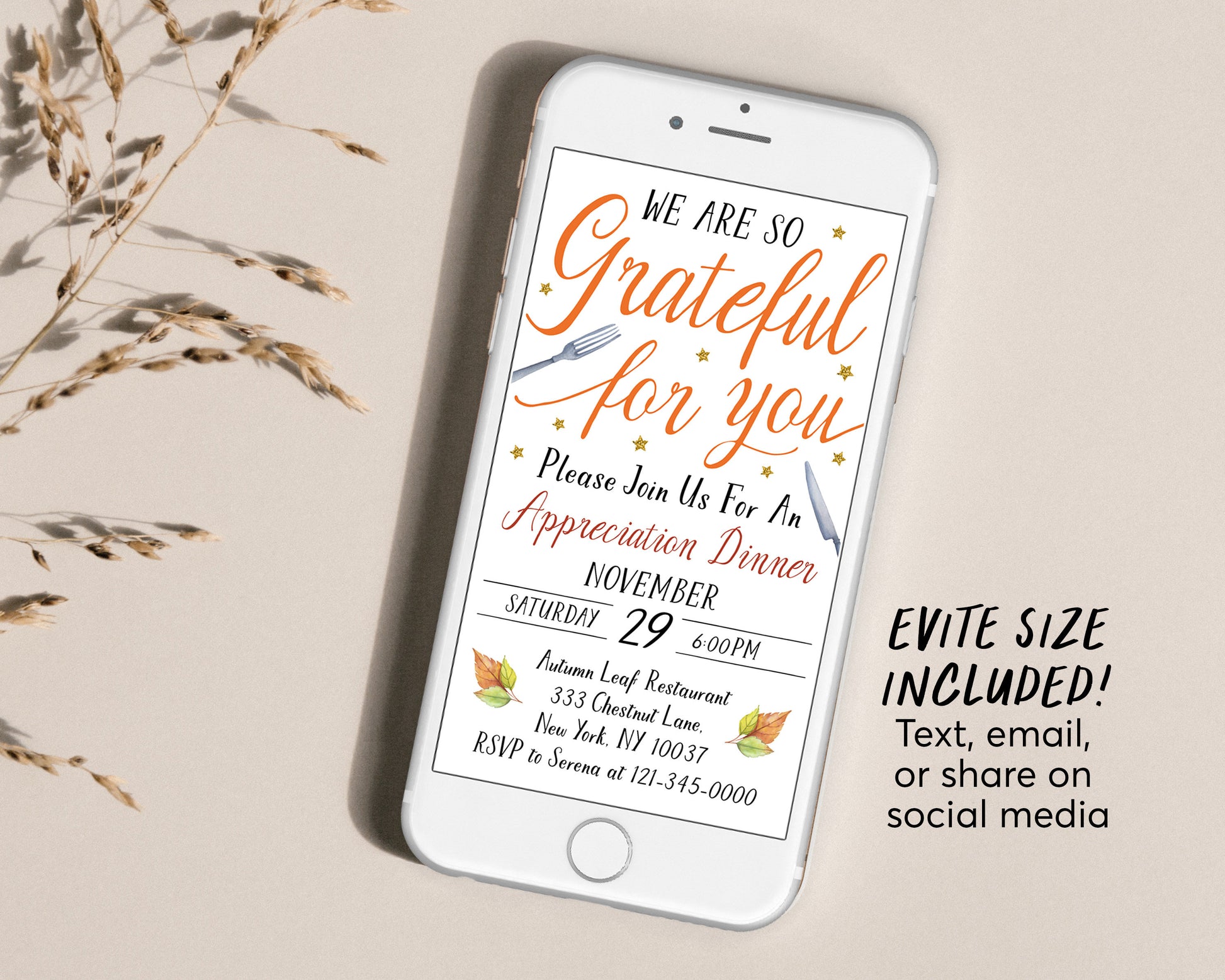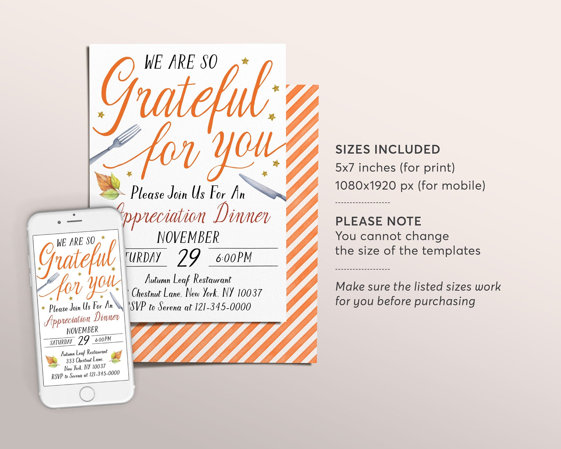 Grateful For You Appreciation Invitation Editable Template, Fall Thanksgiving Dinner Luncheon Invite, Employee Teacher Staff Client Evite