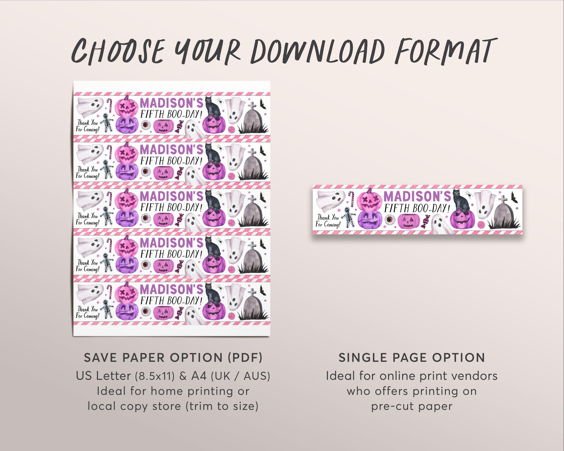 Halloween Birthday Bottle Labels Editable Template, Girl Spooky One Party Drink Wrapper Tags, Hey Boo Little Ghost Spooktacular Bottle Wraps