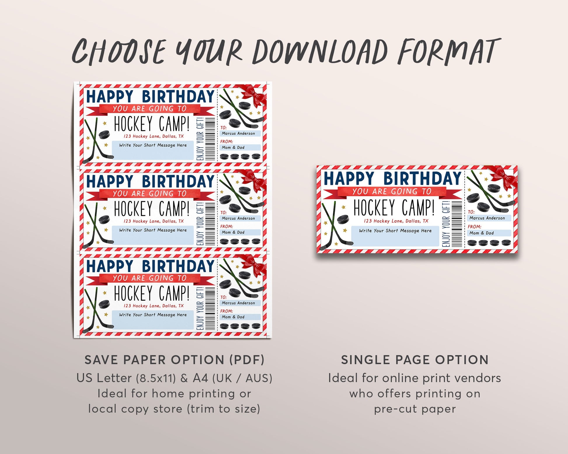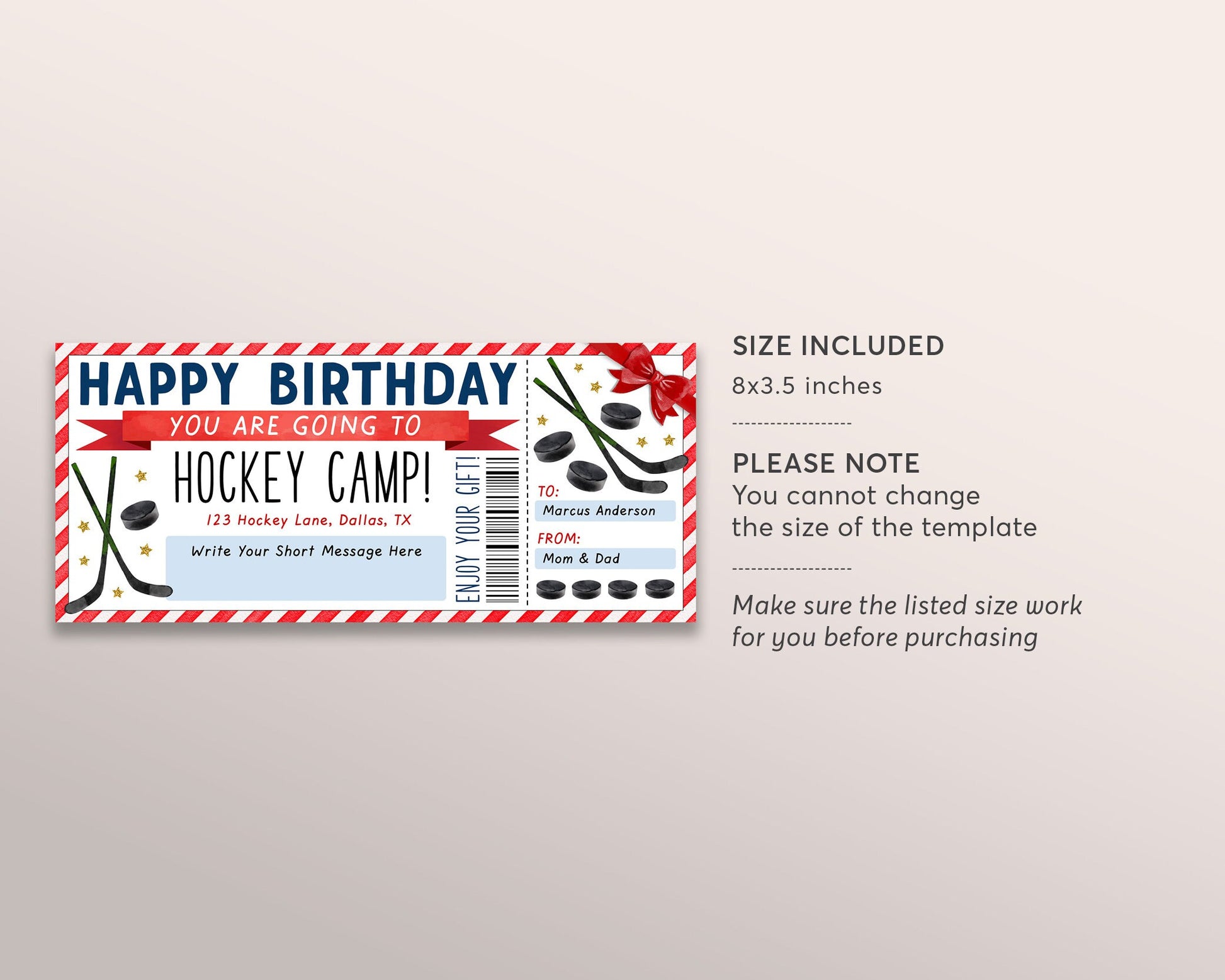 Hockey Camp Gift Ticket Editable Template, Birthday Surprise Training Camp Sports Game Voucher Skills Clinic Coupon Certificate Hockey Lover