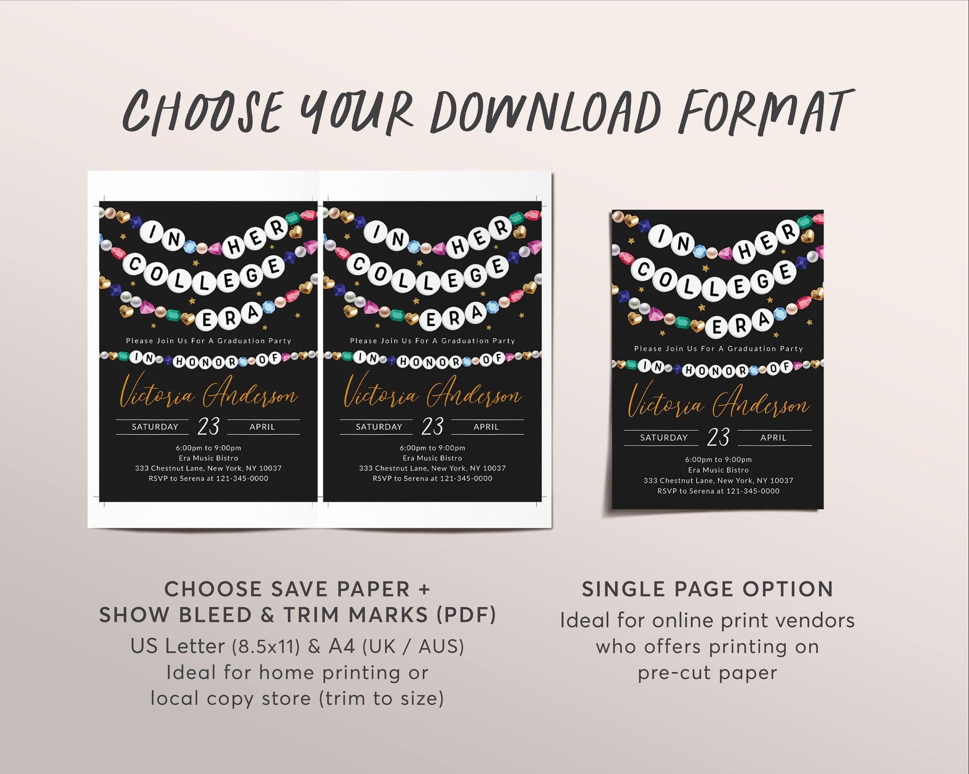 In Her College Era Birthday Invitation Editable Template, Graduation Announcement Friendship Bracelet Party Invite, Grad Black Gold Evite