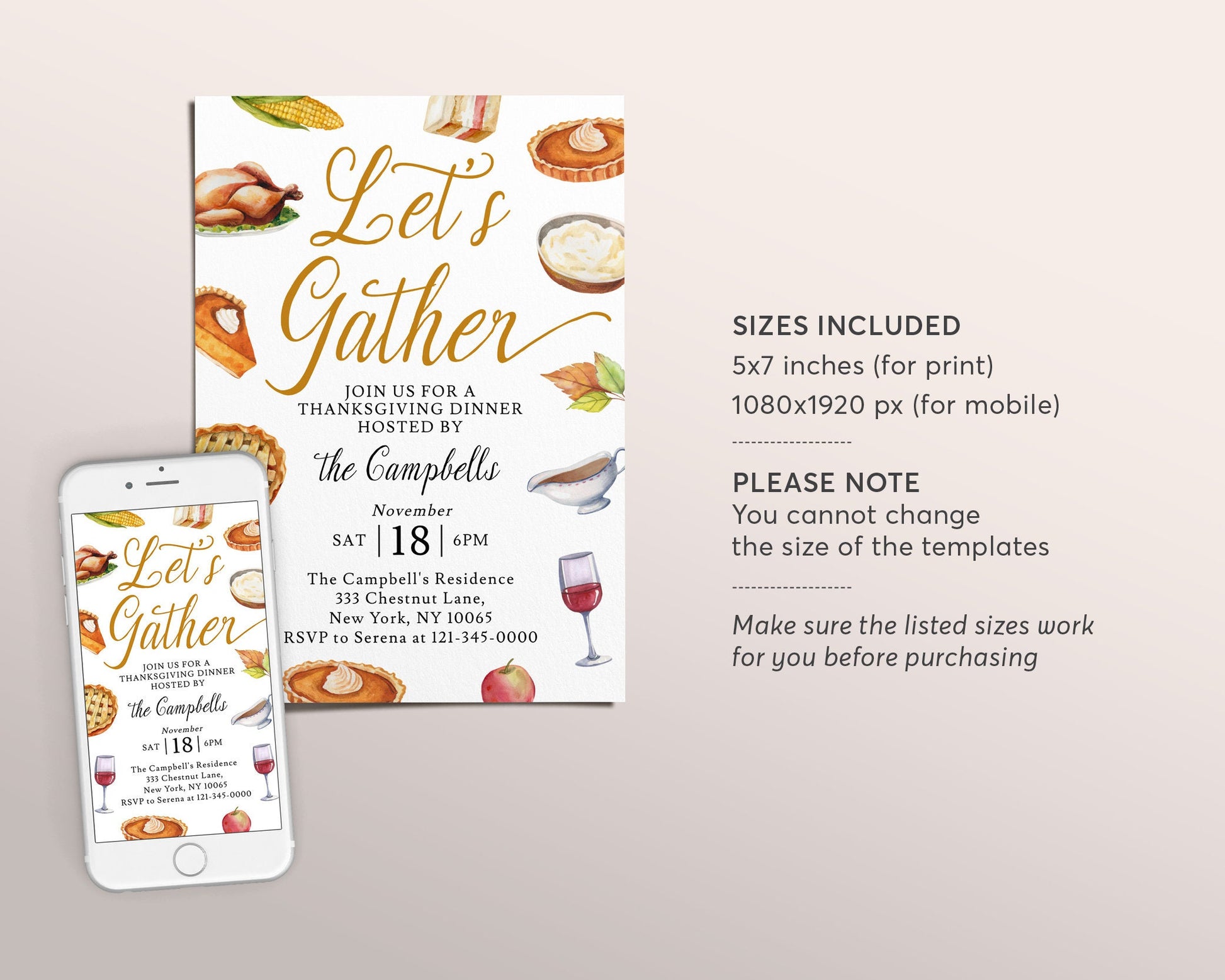 Let's Gather Thanksgiving Invitation Editable Template, Friendsgiving Potluck Dinner Party Invite, Fall Autumn Holiday Family Reunion Feast