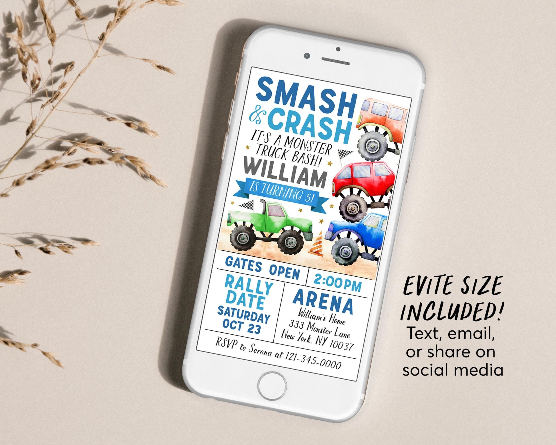 Monster Truck Birthday Invitation Editable Template, It's A Monster Truck Bash Invite, Boy Smash And Crash Party Evite Any Age Printable