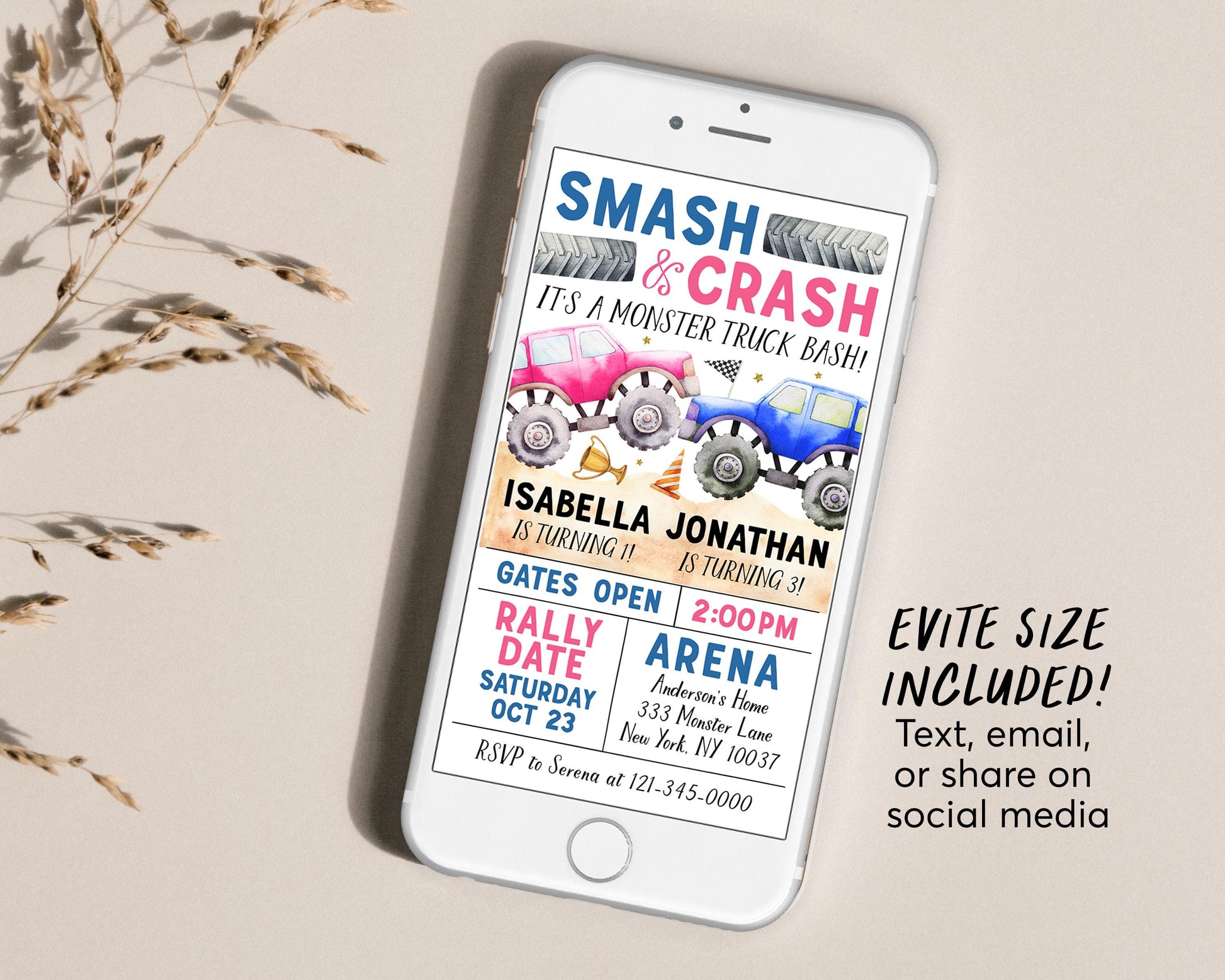 Monster Truck Joint Siblings Birthday Invitation Editable Template, Boy Girl Twins Smash And Crash Party Invite, Monster Truck Bash Evite