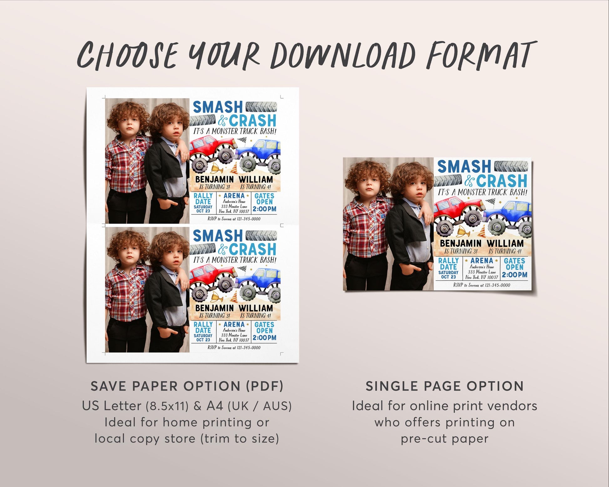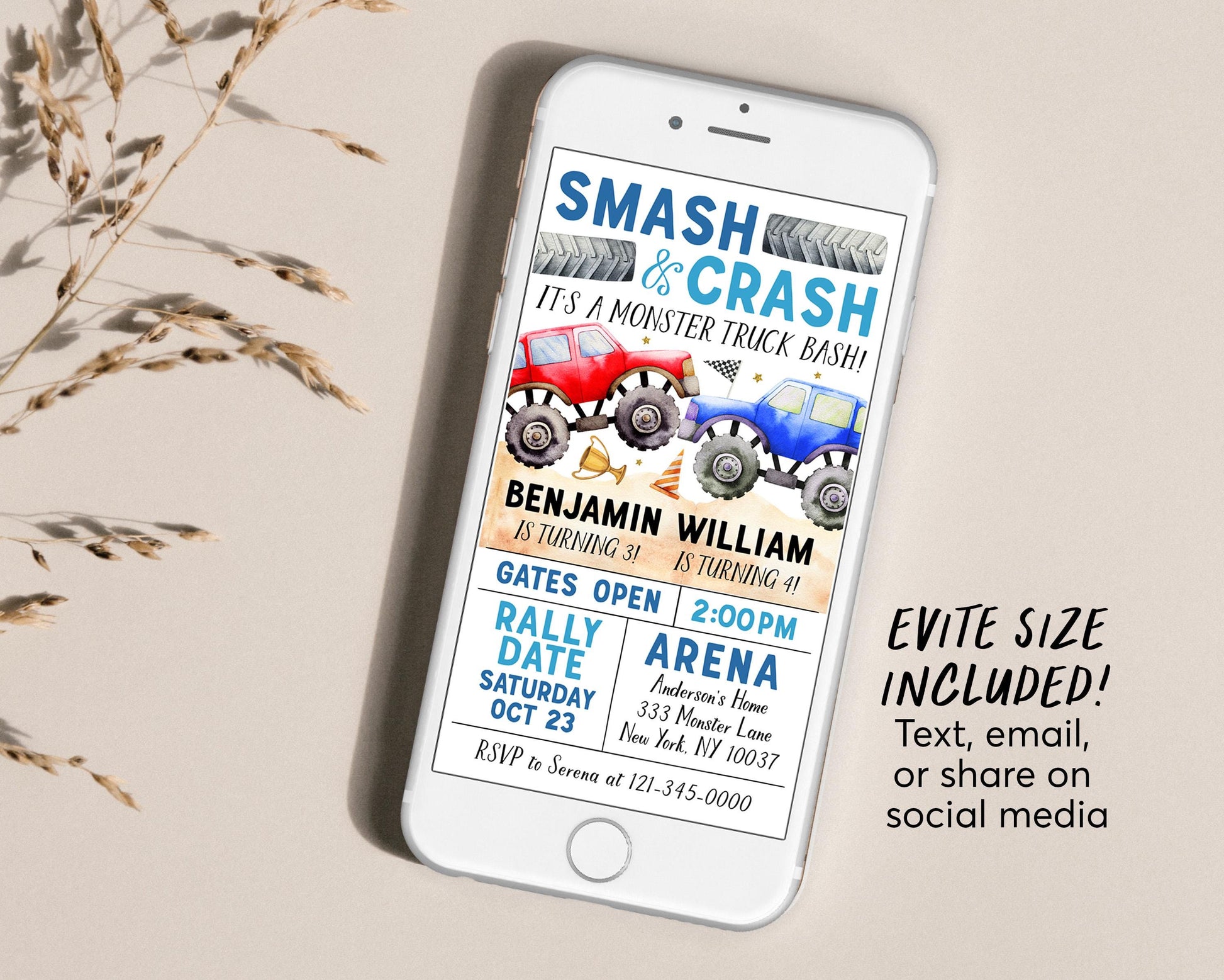 Monster Truck Joint Siblings Birthday Invitation With Photo Editable Template, Boy Twins Smash And Crash Party Invite, Monster Truck Evite