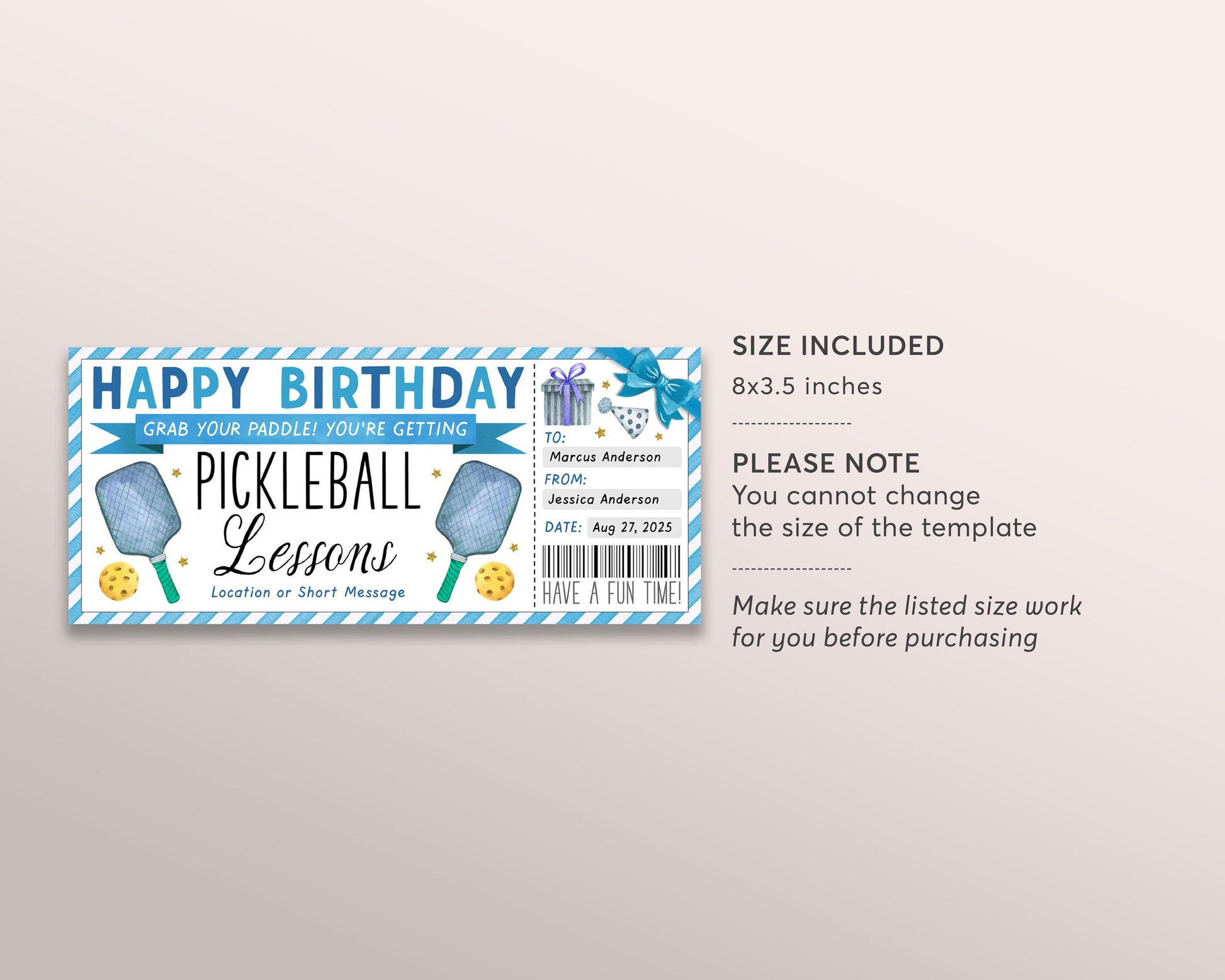 Pickleball Lessons Gift Certificate Editable Template, Birthday Surprise Pickle Ball Classes Voucher, Sports Game Pickleball Lover Gift Idea