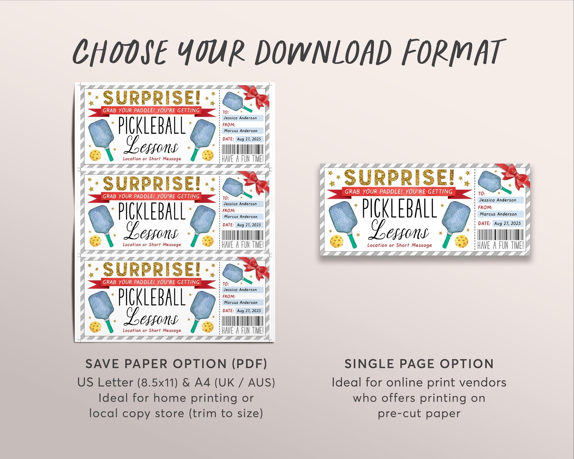 Pickleball Lessons Gift Certificate Editable Template, Surprise Pickle Ball Classes Voucher, Pickleball Lover Gift Idea Experience Coupon