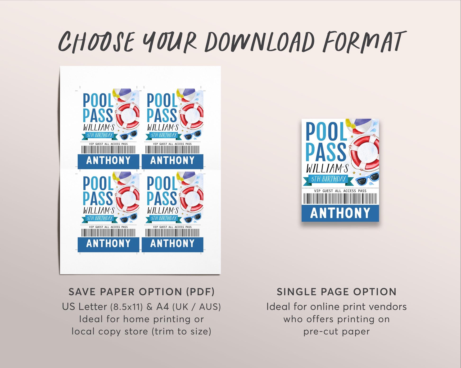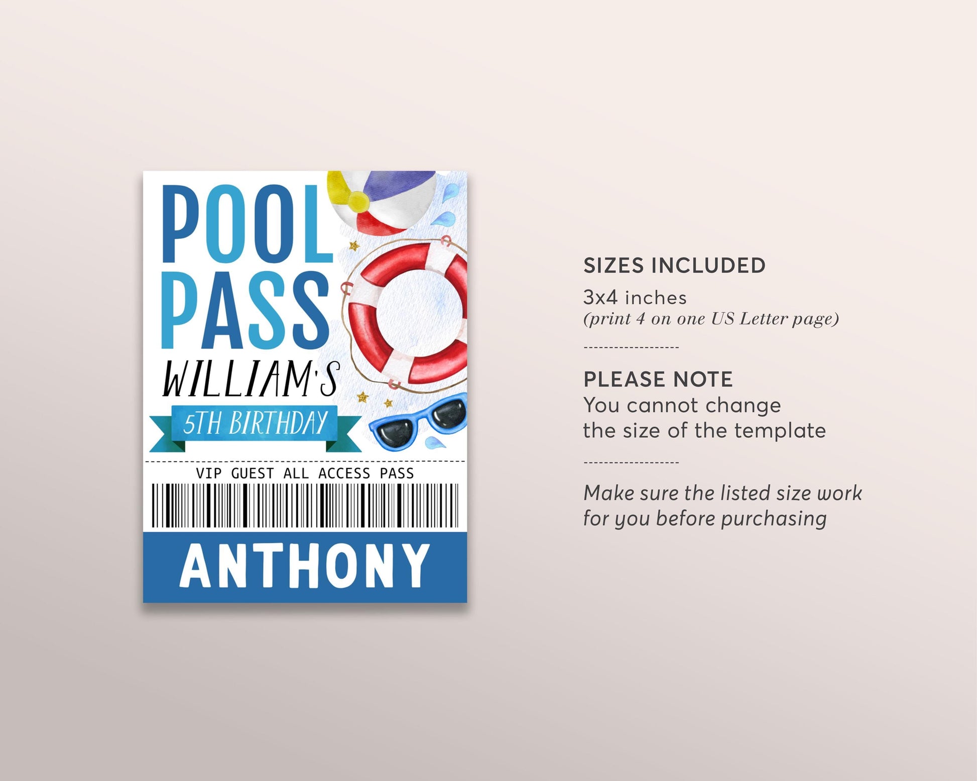 Pool Party Birthday VIP Pass Editable Template, Boy Summer Swimming Pool Pass Party All Access Pass, Guest Name Tag Insert ID Badge Lanyard