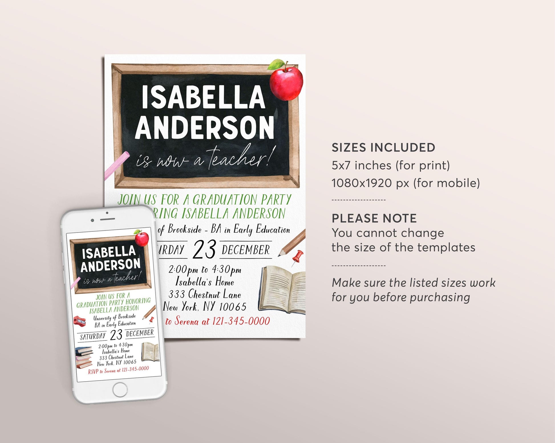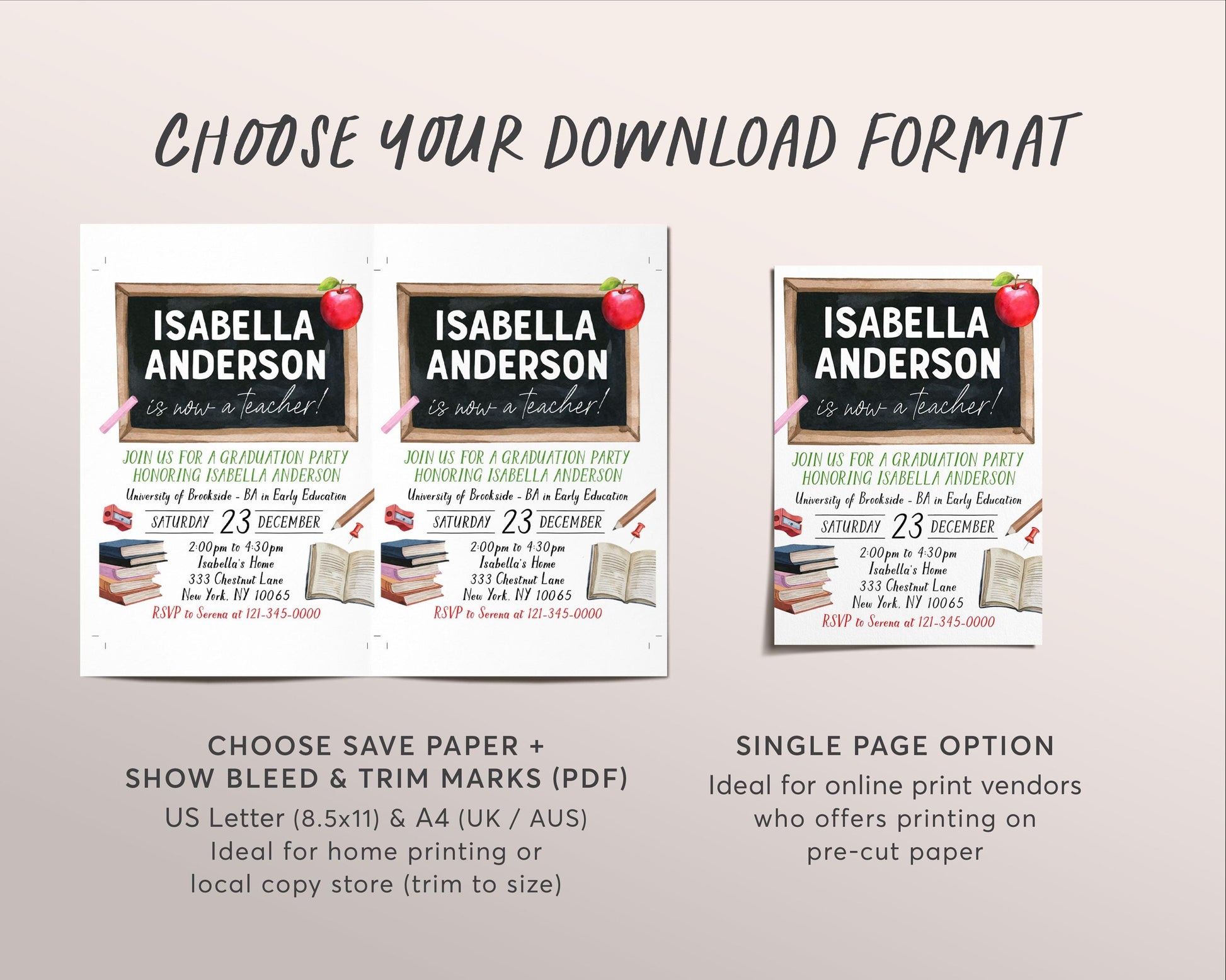 Teacher Graduation Invitation Editable Template, Teaching Diploma Graduation Announcement Party Invite, Early Child Education Grad Evite