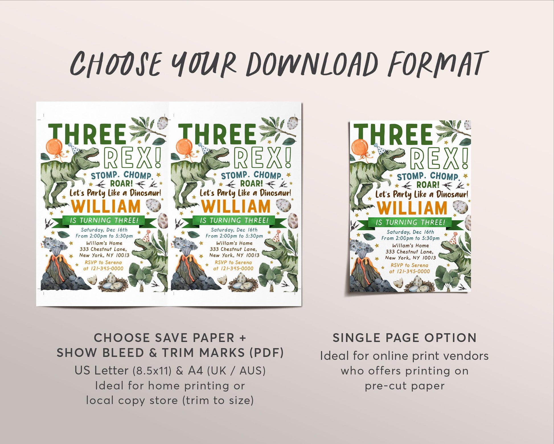 Three Rex Dinosaur Birthday Invitation Editable Template, T-Rex Dino Boy Third 3rd Birthday Party Invite Evite, Tyrannosaurus Jurassic Party