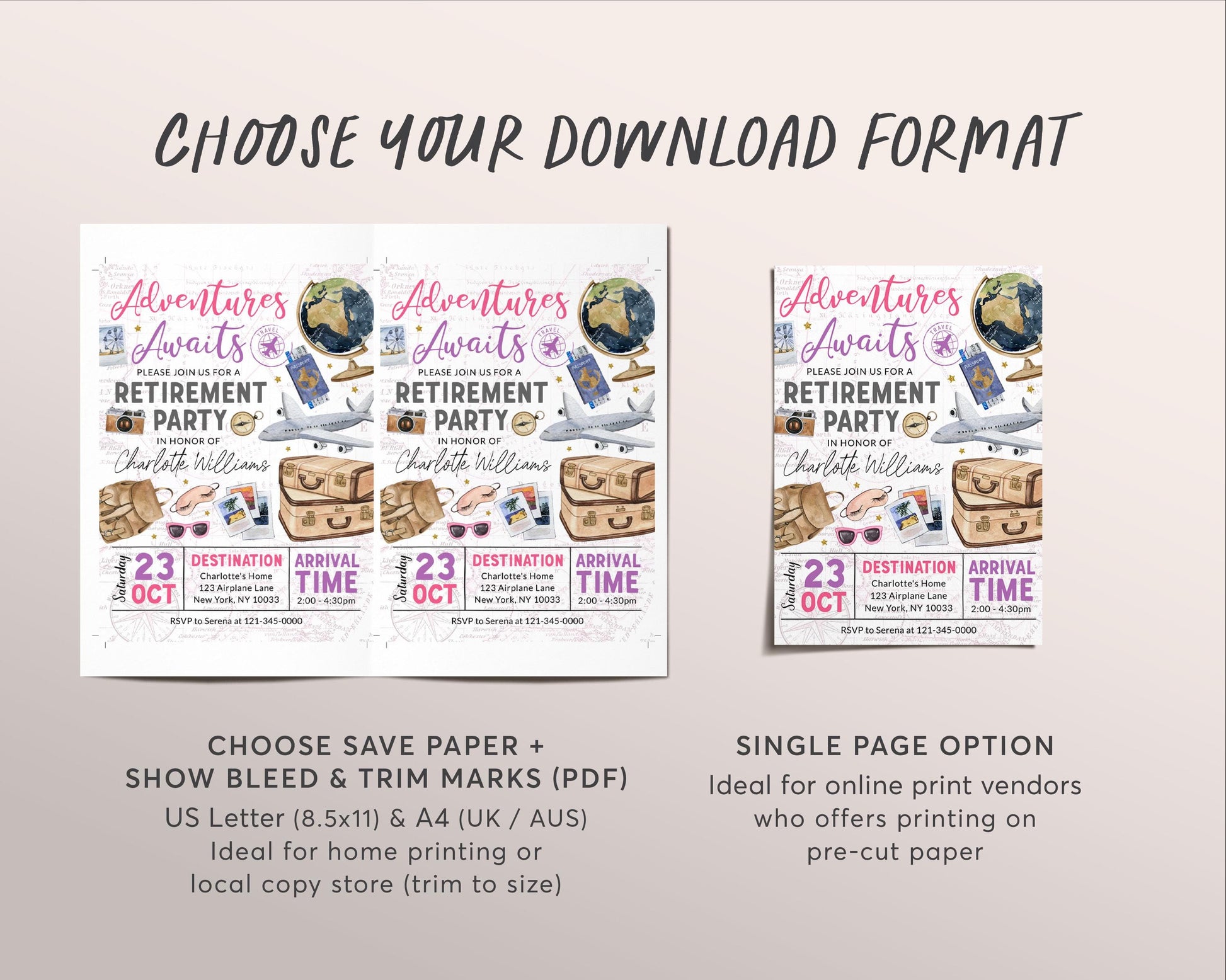 Travel Retirement Invitation Editable Template, Adventure Awaits Retirement Farewell Party Invite For Her, Around The World Airplane Evite
