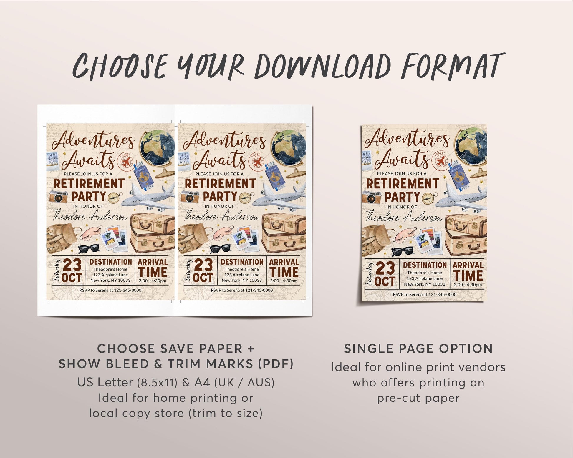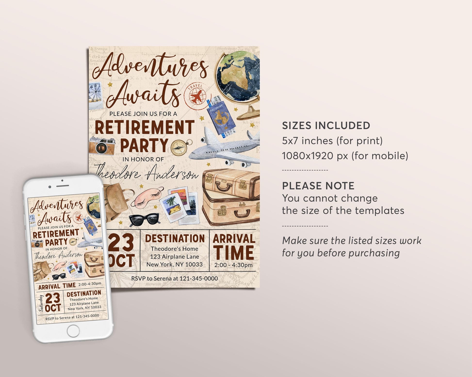 Travel Retirement Invitation Editable Template, Adventure Awaits Retirement Farewell Party Invite, Vintage Map Airplane Luggage Globe Evite