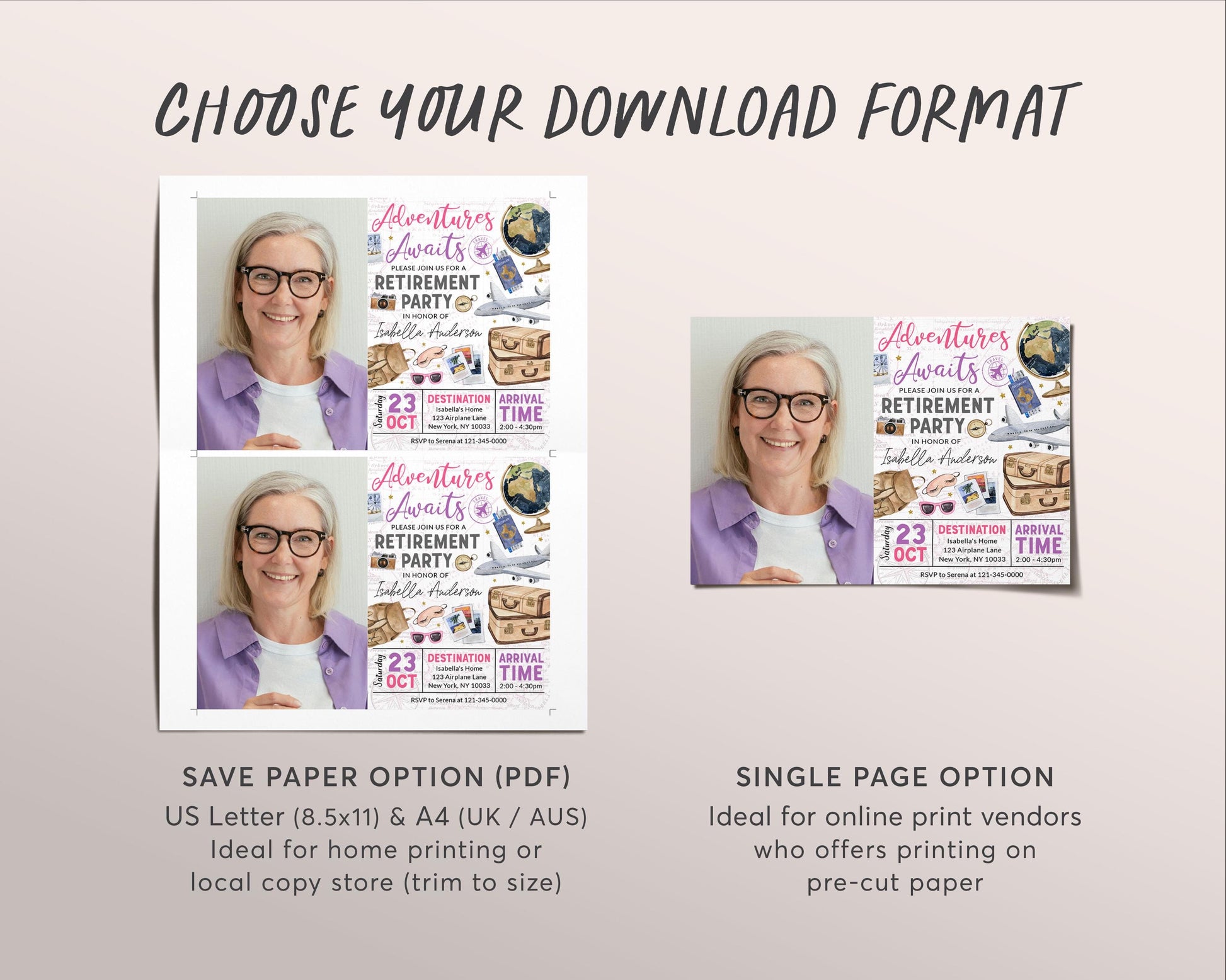 Travel Retirement Invitation With Photo Editable Template, Adventure Awaits Retirement Farewell Party Invite For Her, Around The World Evite