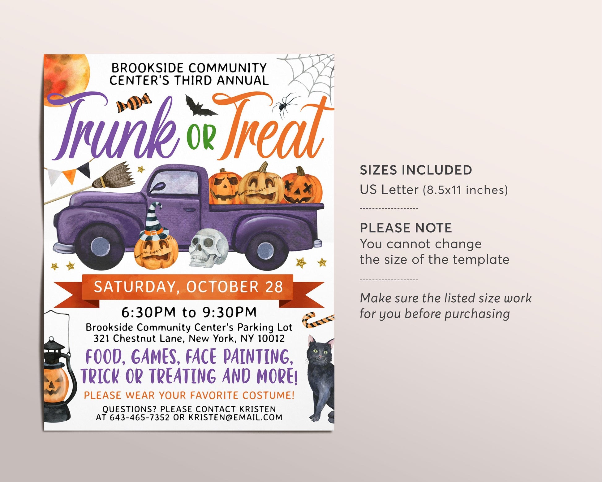 Trunk or Treat Flyer Editable Template, Halloween Night Party Flyer Invitation, Trick Or Treat Truck Fall Party Invite Neighborhood Event
