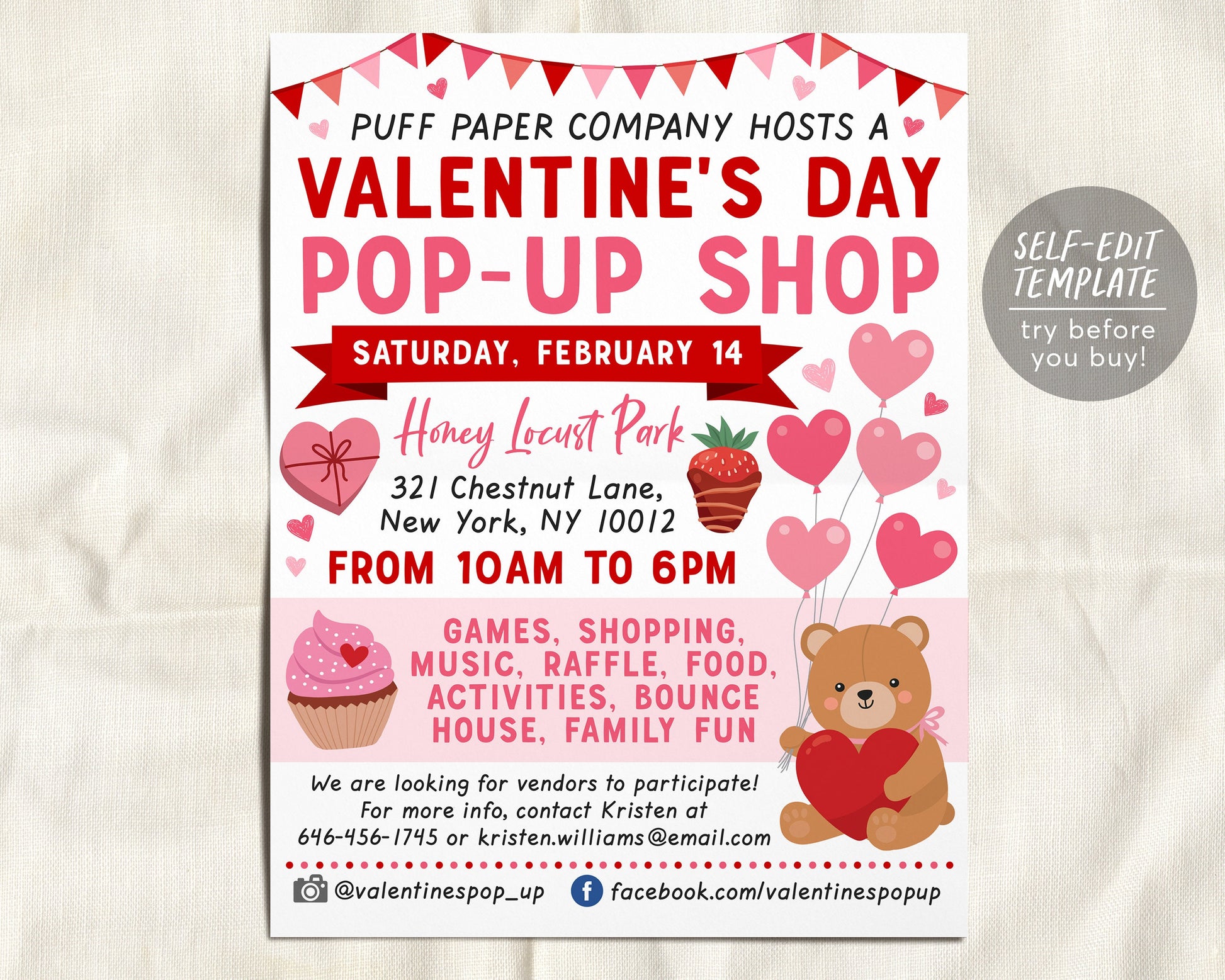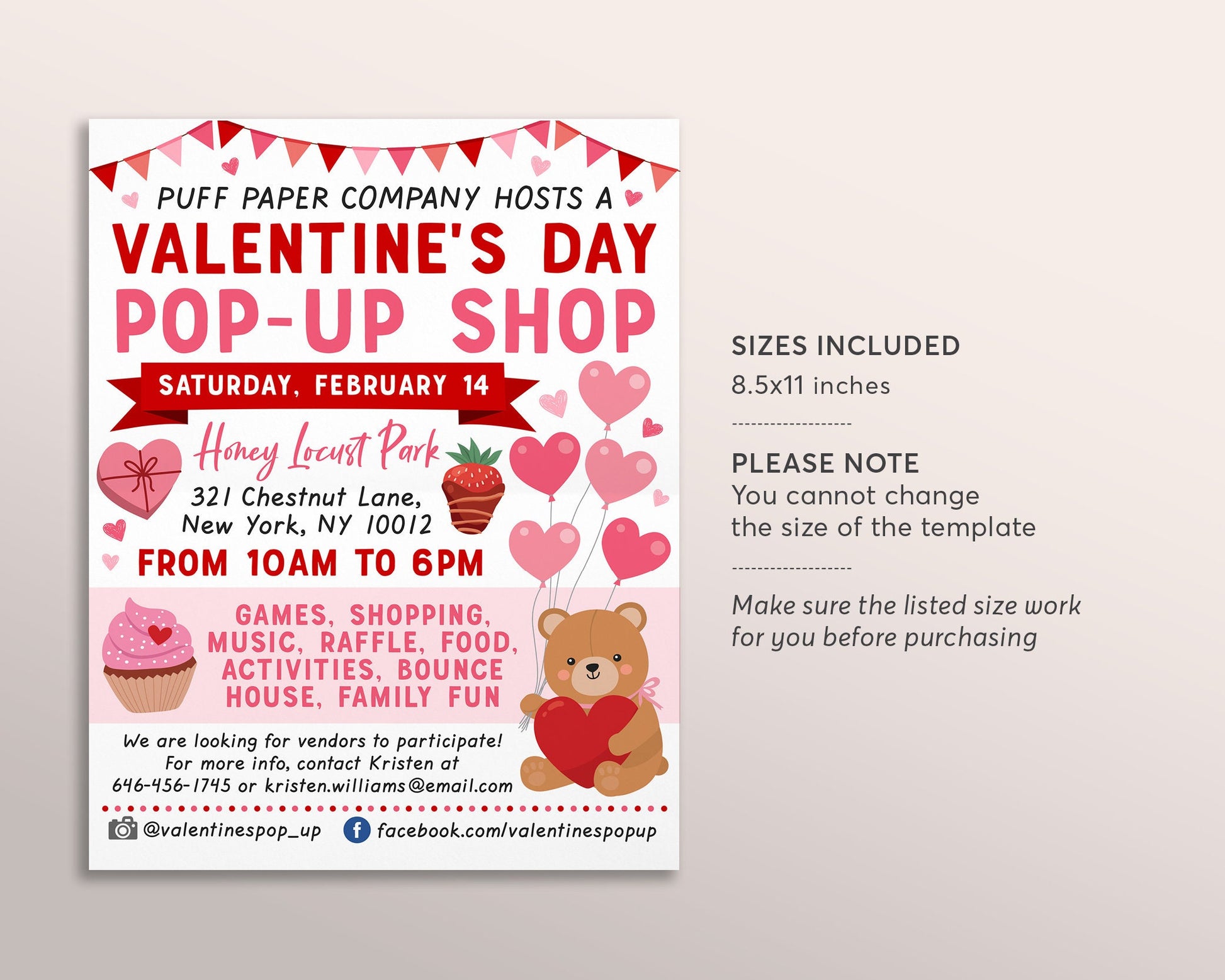 Valentine's Day Pop Up Shop Flyer Editable Template, Valentine Party Shopping Pop Up Store Fundraiser, Business Charity Non Profit Event