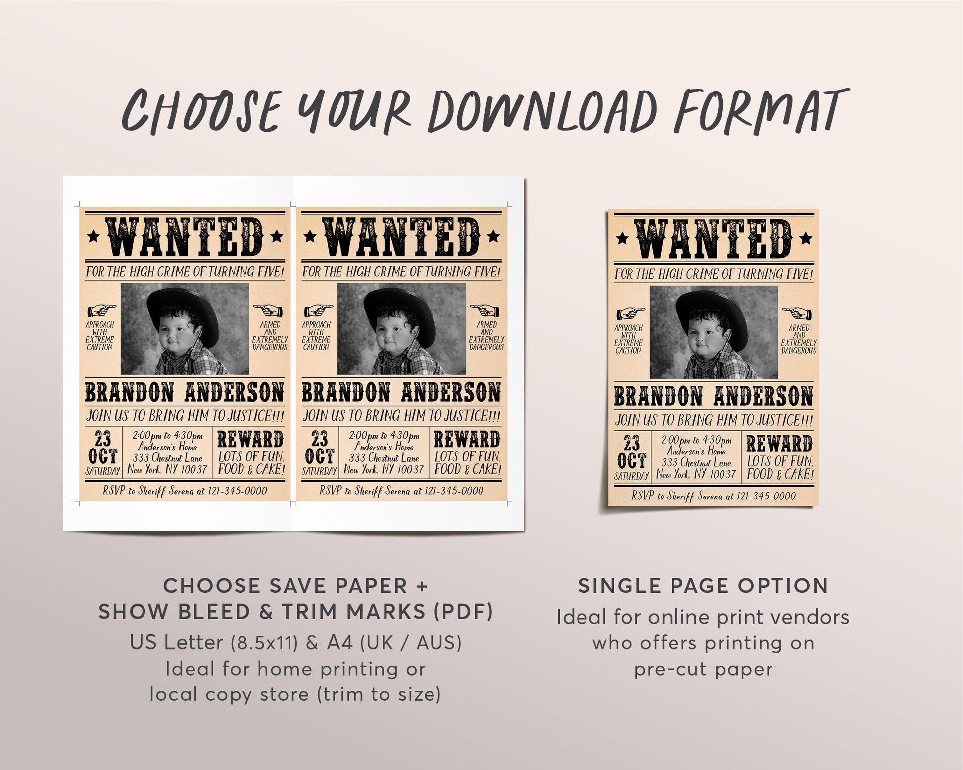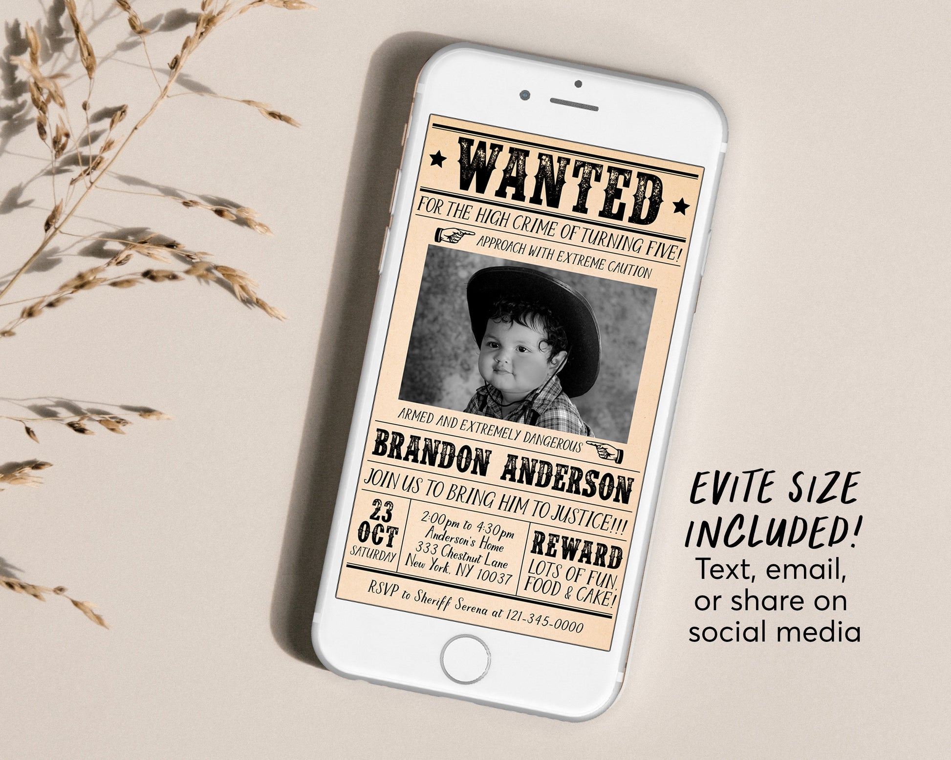 Wanted Poster Invitation With Photo Editable Template, Cowboy Cowgirl Western Outlaw Birthday Party Invite, Wild West Southwestern Evite