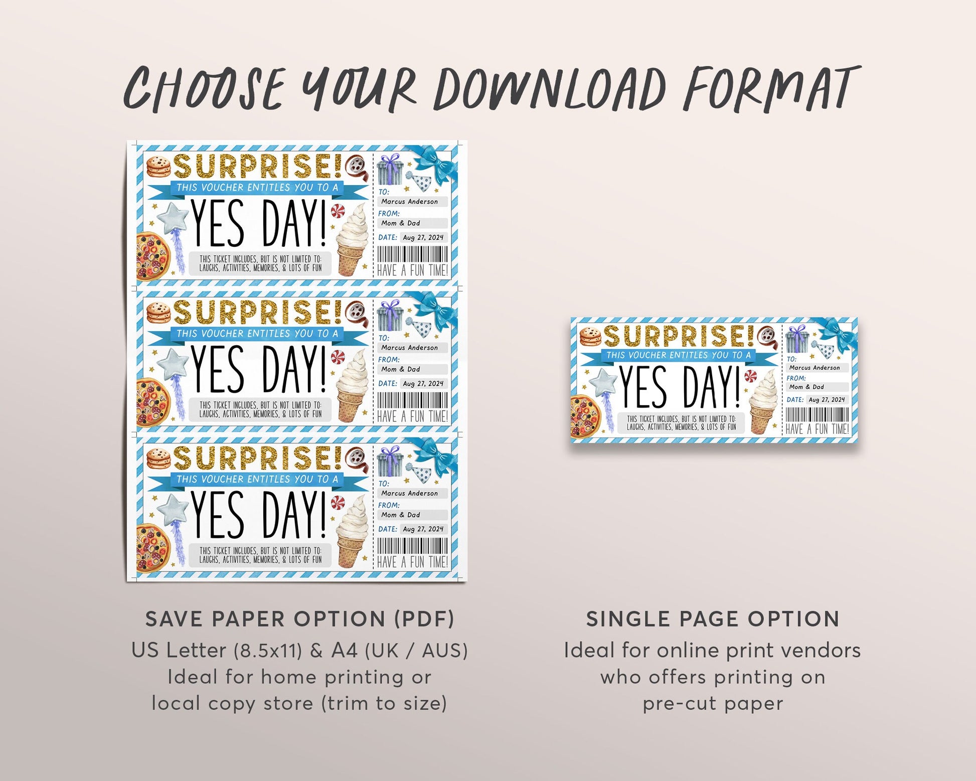 Yes Day Ticket Editable Template, Surprise Best Day Ever Gift Certificate For Kids, Fun Day Ticket Gift Card Fun Experience Voucher Coupon